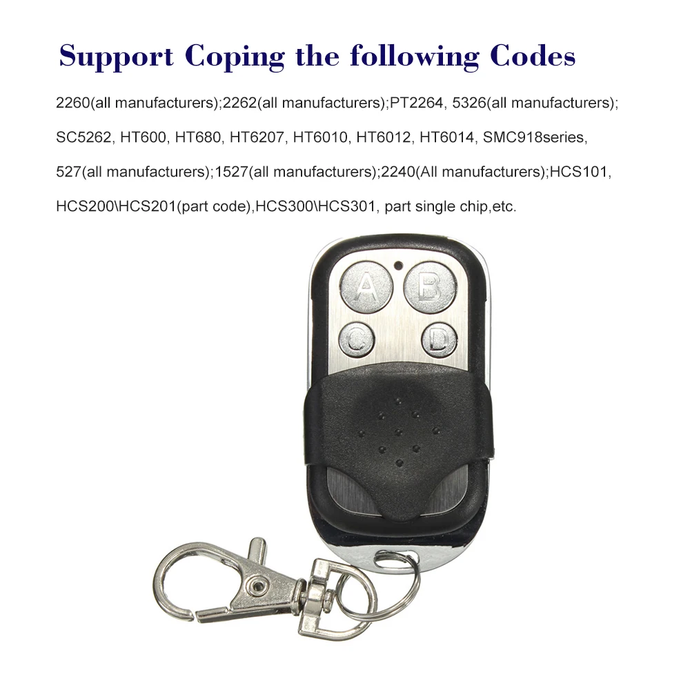 Поддержка следующих кодов: 2260 (все производители);2262 (все производители);PT2264, 5326 (все производители);SC5262, HT600, HT680, HT6207, HT6010, HT6012, HT6014, SMC918series,527 (все производители);1527 (все производители);2240 (все производители);HCS101, HCS200 HCS201 (код детали),HCS300 HCS301, однократный чип и т. Д.