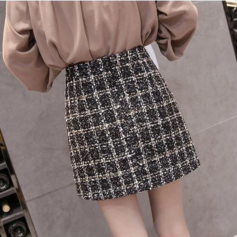 Осенне-зимняя шерстяная мини-юбка 2019 Женская винтажная клетчатая золотистая двубортная твидовая трапециевидная юбка с высокой талией Femininas