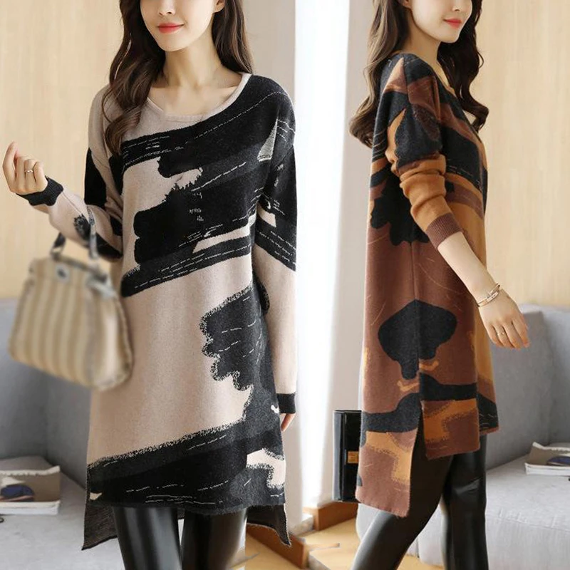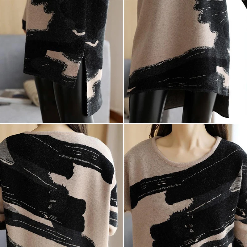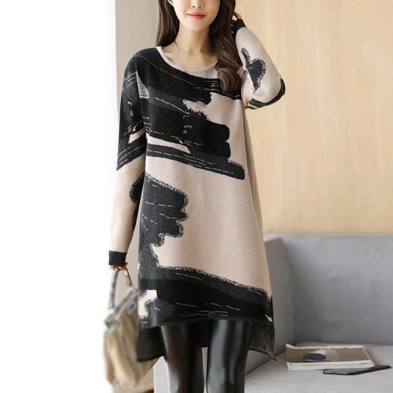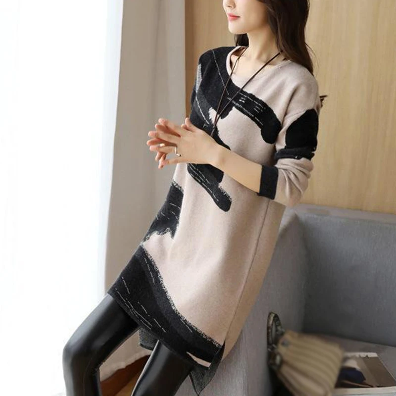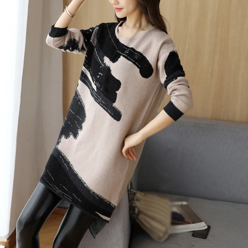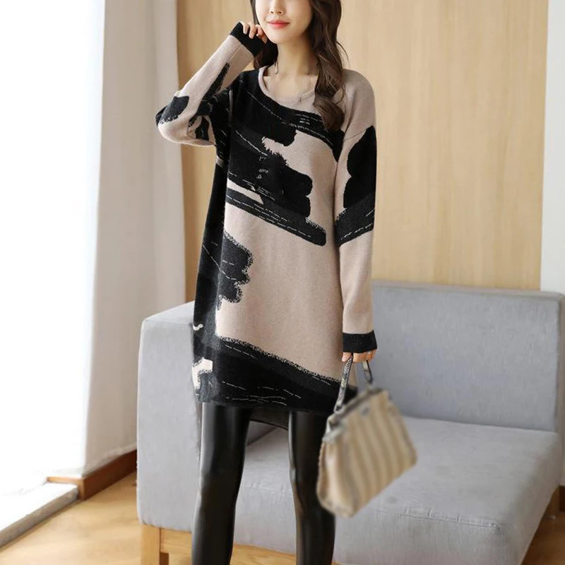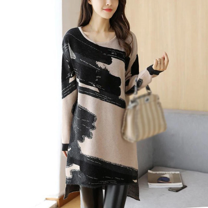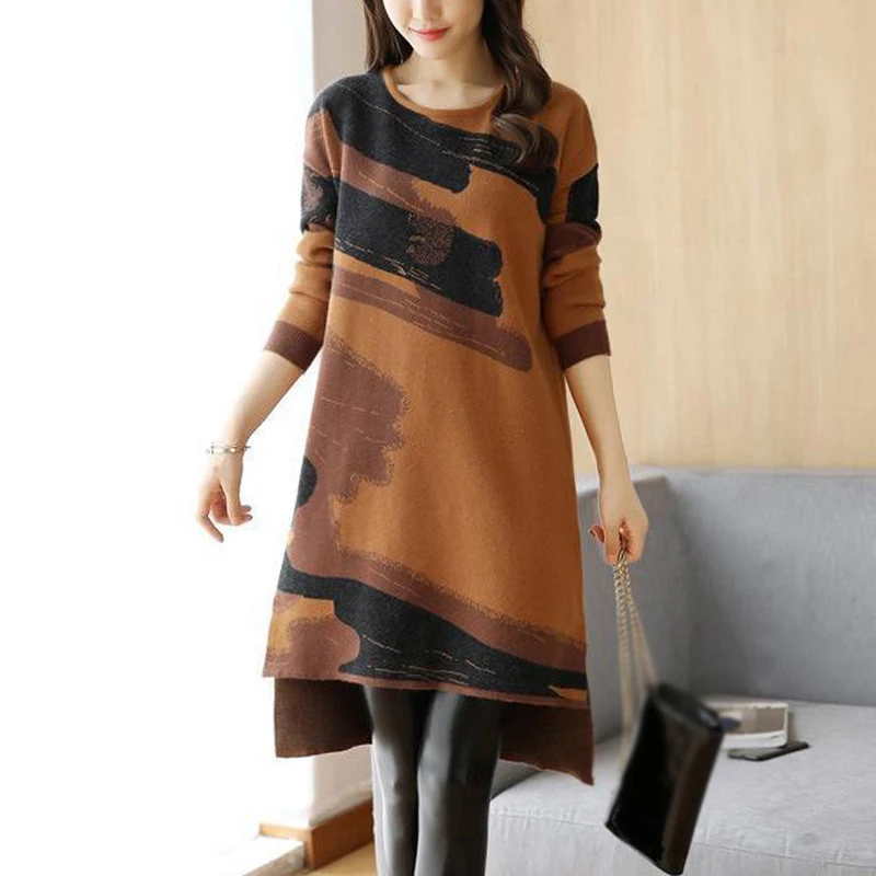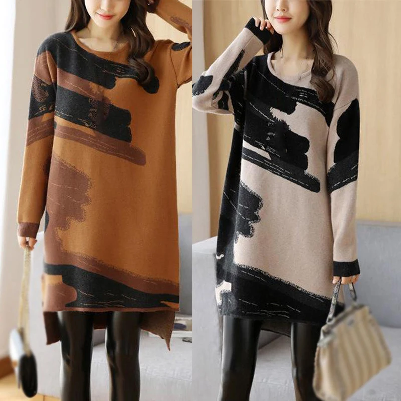 * Описание товара:Женские повседневные свободные прямого кроя платье с круглым вырезом с длинным рукавом Трикотажный свитер плюс размер