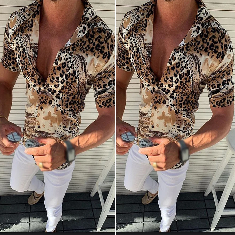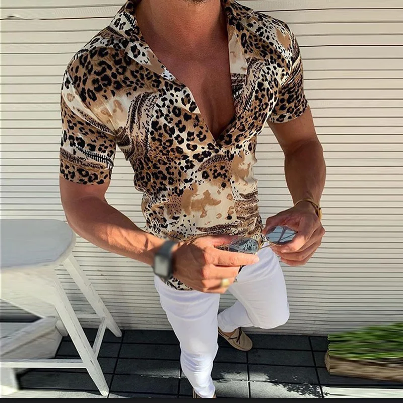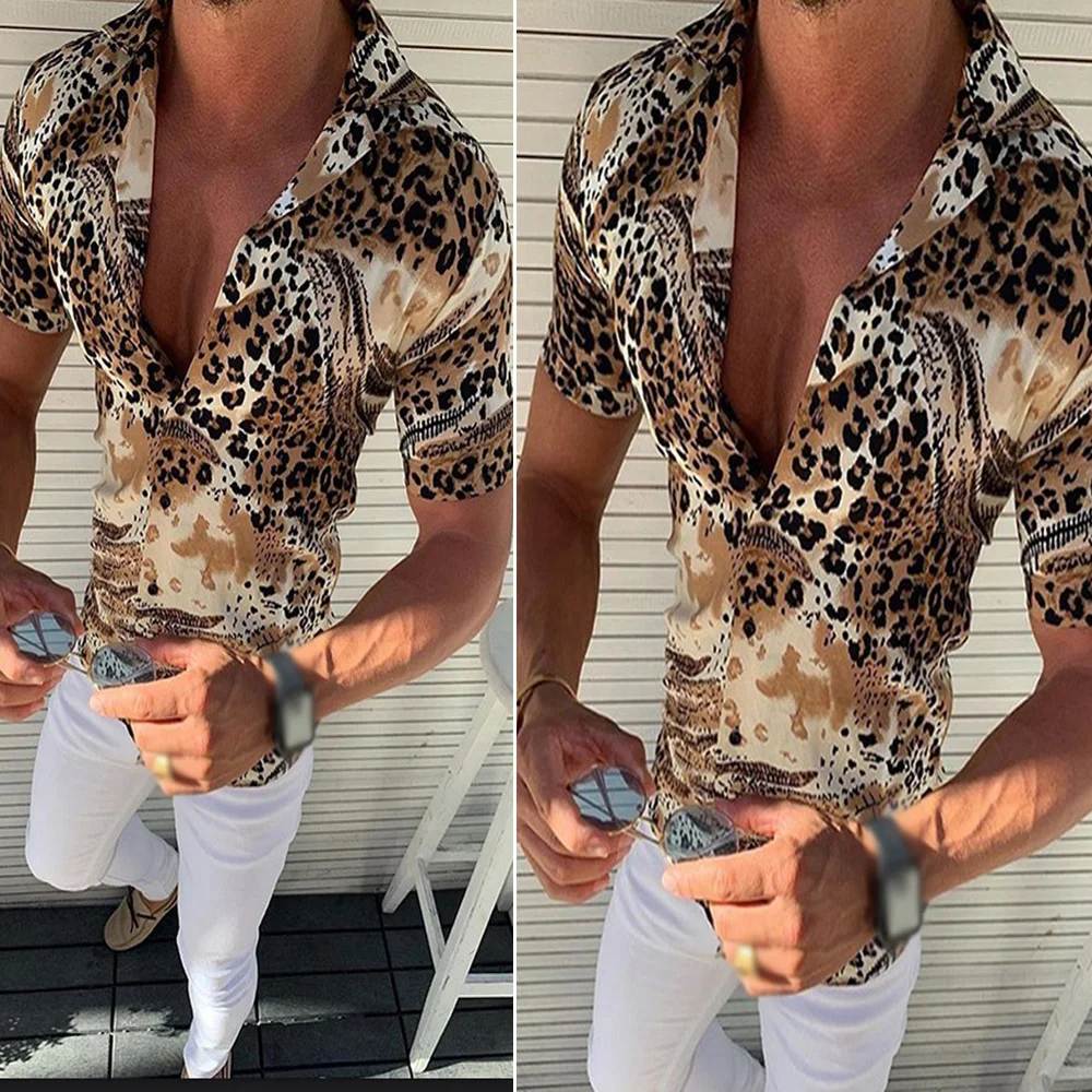 * Описание товара: Мужской, модный, Повседневный, тонкий, Леопардовый принт, лацкан, короткий рукав, футболка