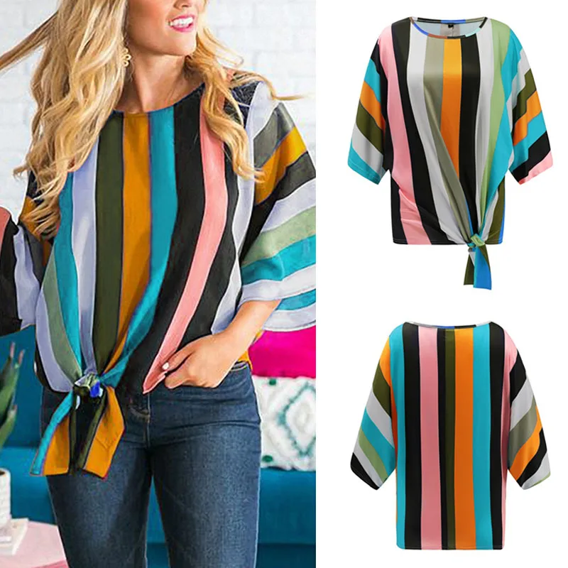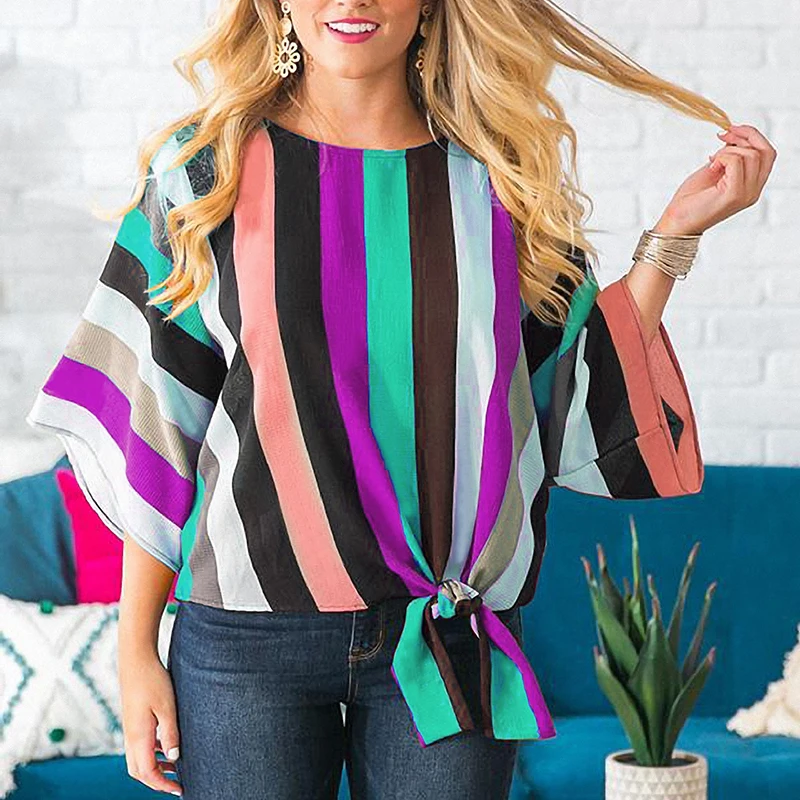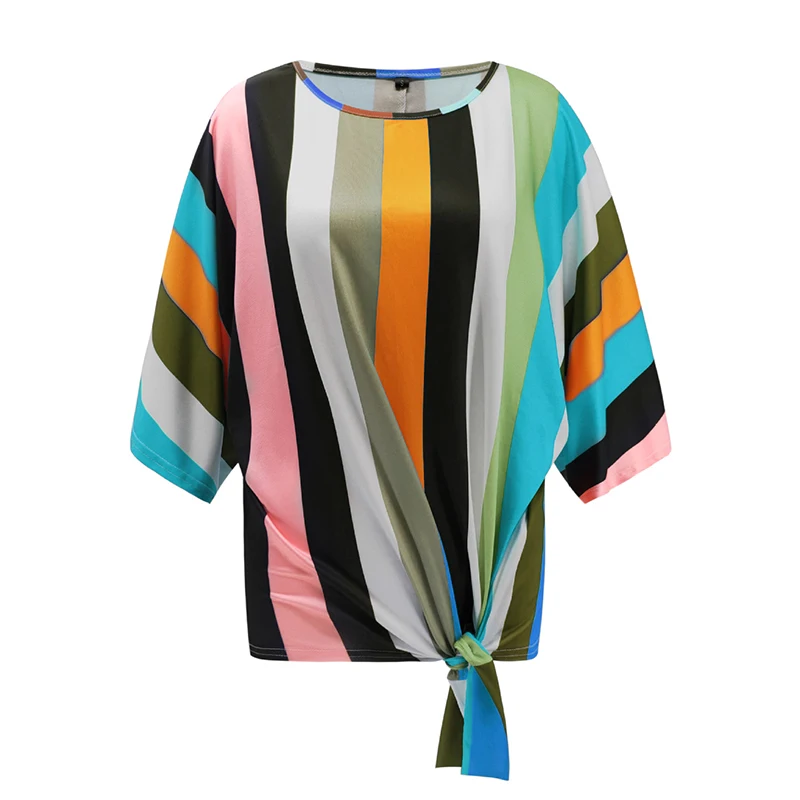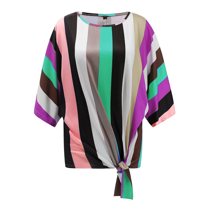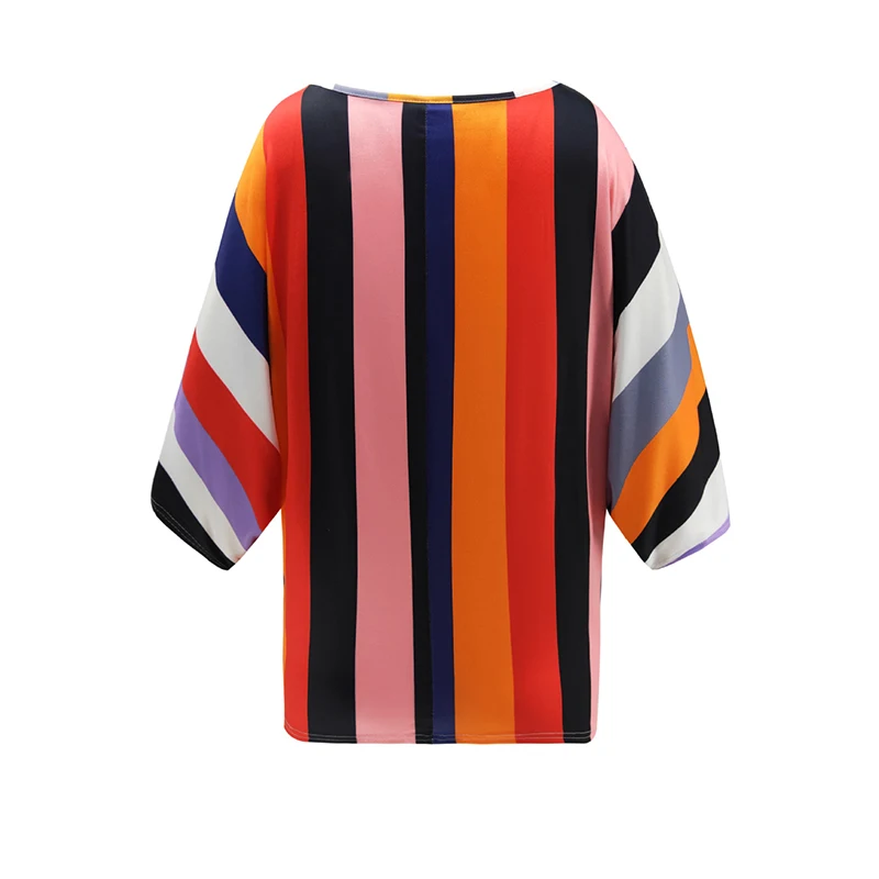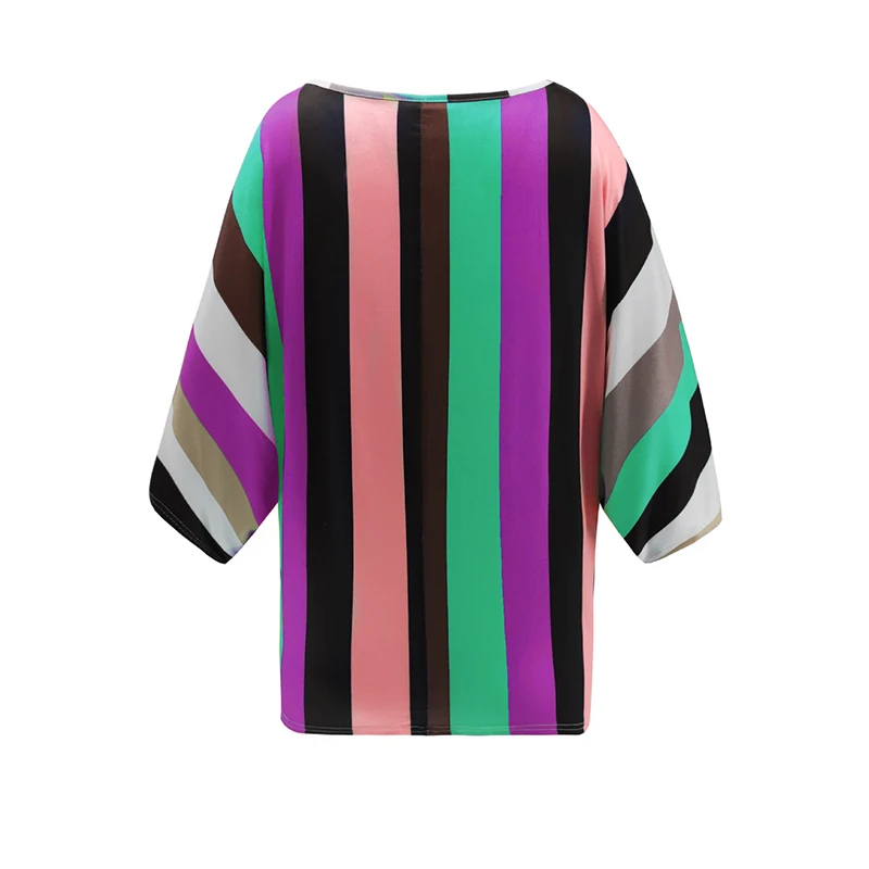 * Описание товара: свободный крой, круглый вырез, полосатый принт, рукав 3/4, рукав "летучая мышь"