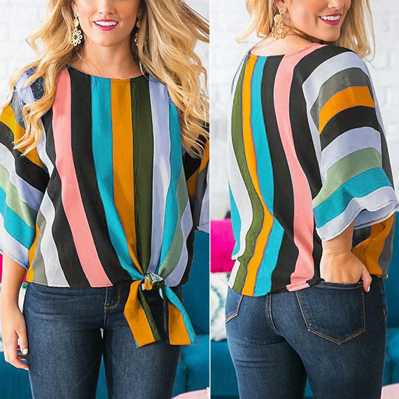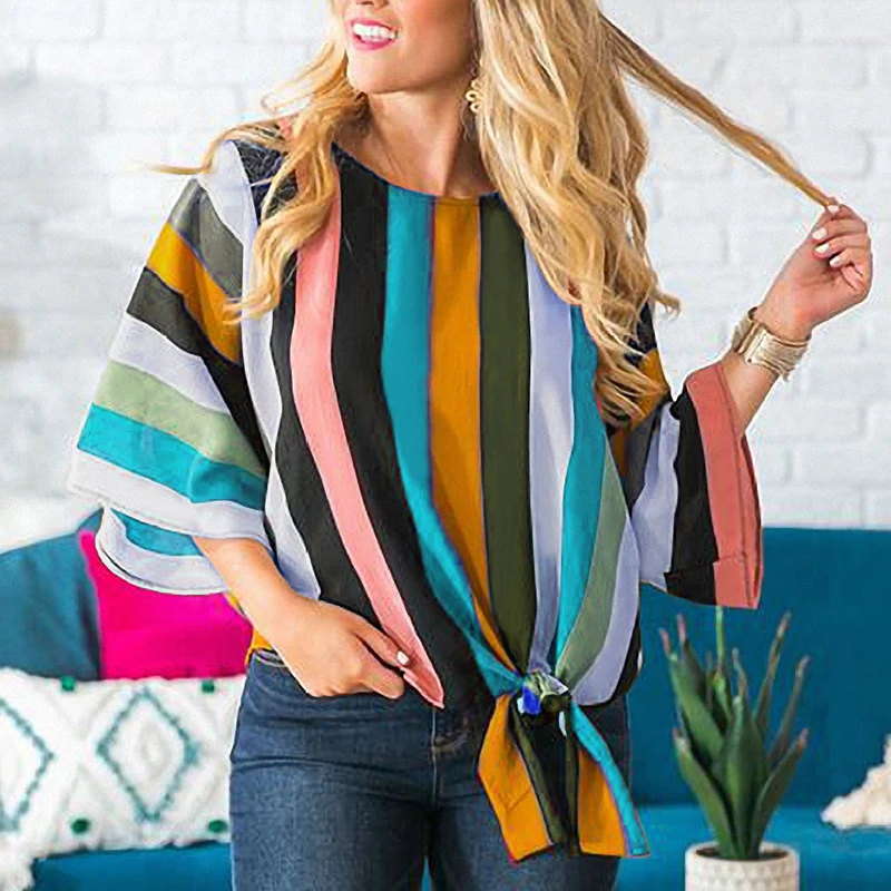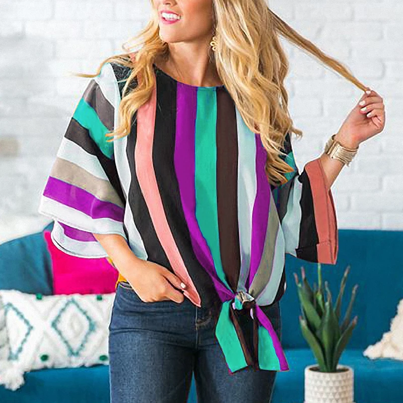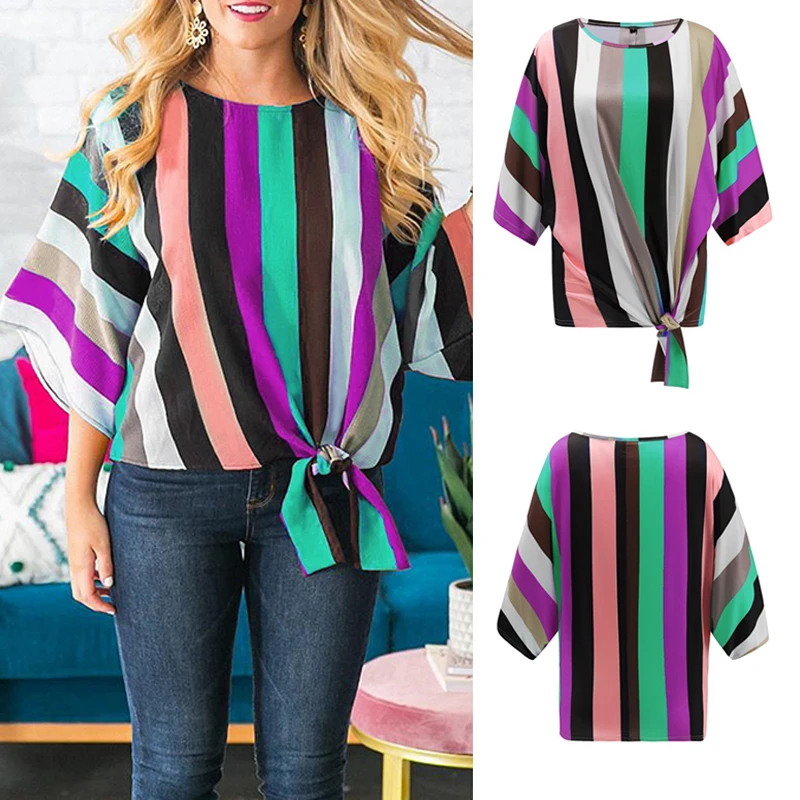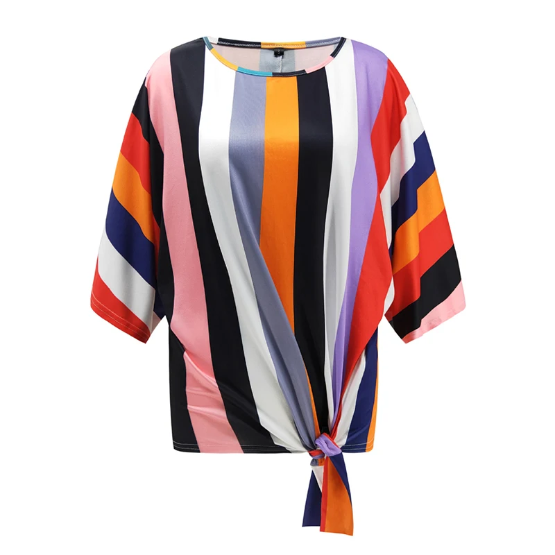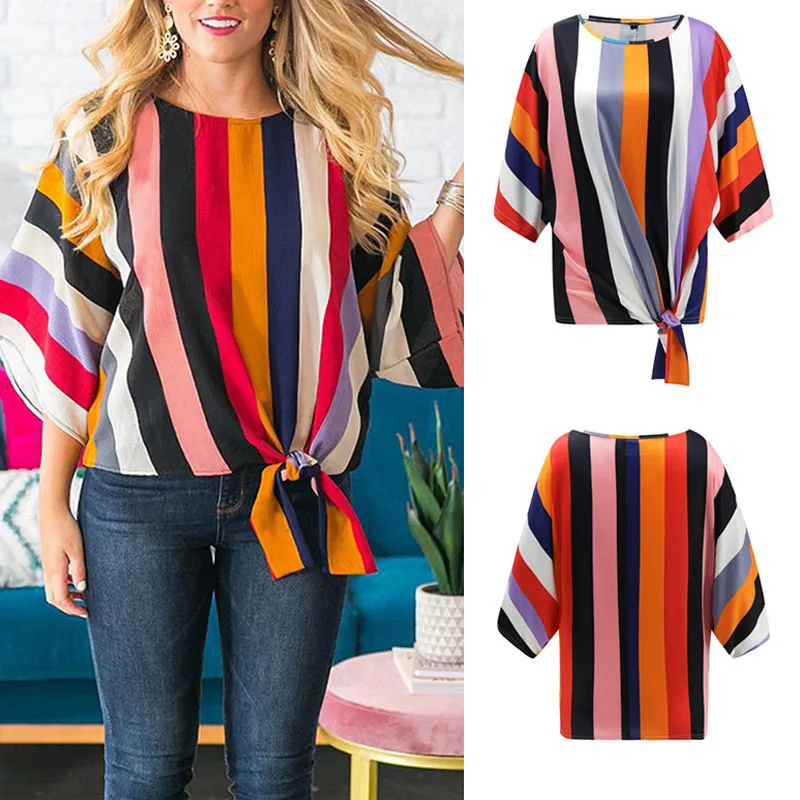 * Описание товара: свободный крой, круглый вырез, полосатый принт, рукав 3/4, рукав "летучая мышь"