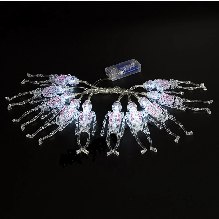 Информация о продукте: 1. Название: светодиодный в виде скелета на Хэллоуин в форме струны 2. Материал: пластик 3. Входное напряжение: 4,5 (В) 4. Световой поток: 7 (лм) 5. Срок службы: 6000 (ч) 6. Уровень защиты: IP44 7. Мощность: 0,06 Вт 8. Цвет света: теплый белый, красочный 9. Режим питания: 2/3 * батарейки типа АА (в комплект не входят) Упаковочный лист: Строки света * 1 Пластик сумка * 1