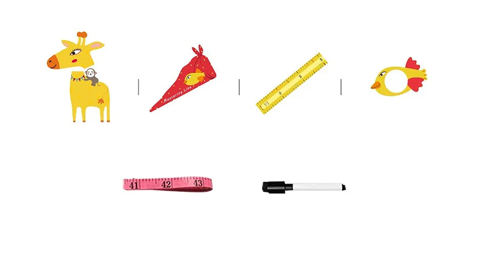 Милая голова жирафа x 1 Скользящий измеритель x 1 Линейки измерителей x 4 Гибкая линейка x 1 (случайный цвет) Ручка для белой доски x 1