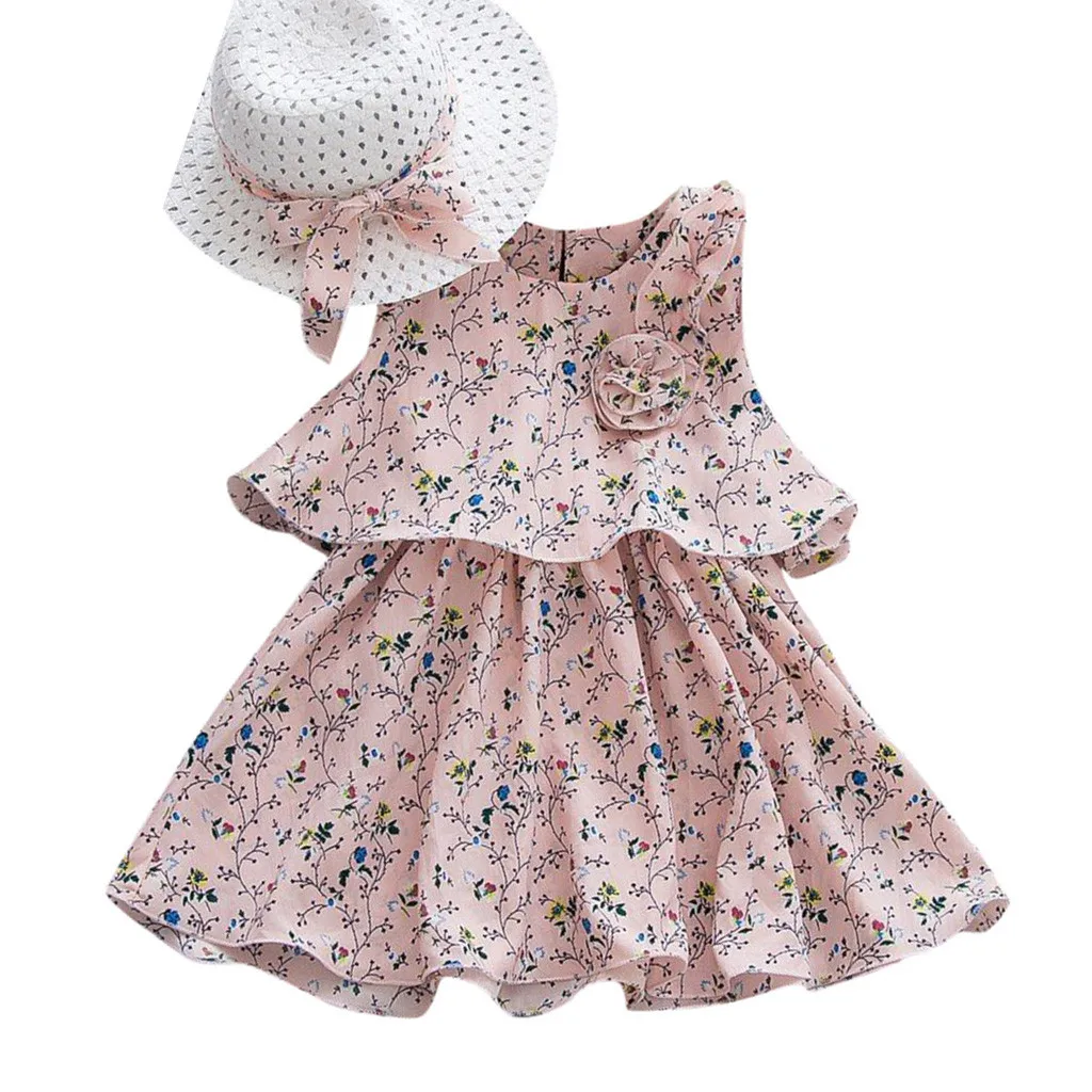 Платья принцессы без рукавов с цветочным рисунком для маленьких девочек; одежда с бантом и шляпой