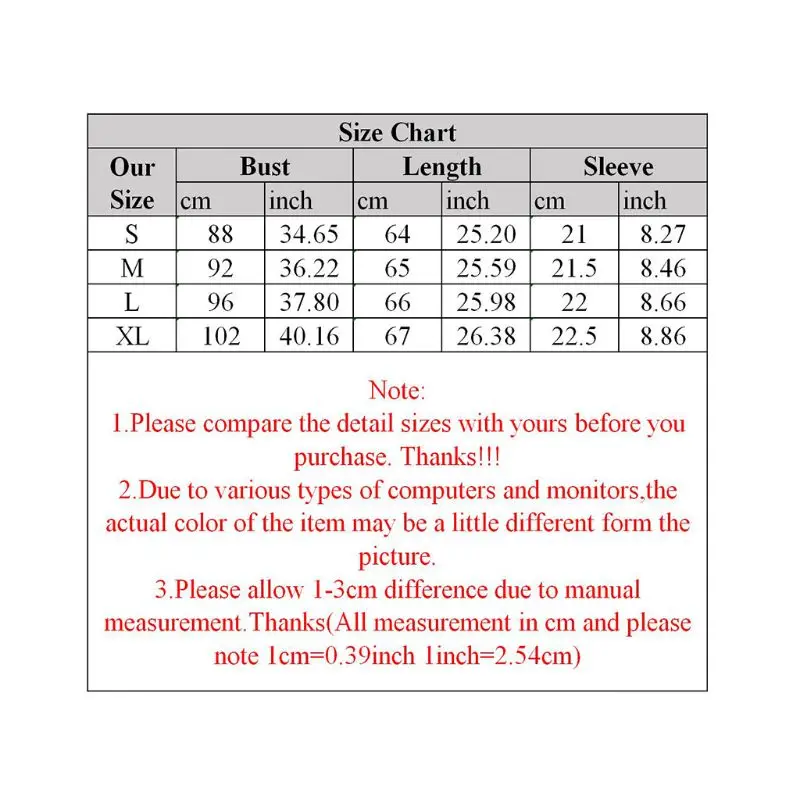 Особенности: 100% новый товар высокого качества. Материал: полиэстер Особенности: круглый вырез, изогнутый подол, короткий рукав, цветочный принт, свободная рубашка, повседневный Свободный Топ. Уникальный: простой и Базовый стиль, повседневные и свободные топы, приятные и удобные, лучший подарок для подружек, дочерей, сестер, мам Свободная блузка идеально подходит для повседневной носки, свиданий, работы, покупок, дома, вечерние, фестивальные, путешествия, бега, школы, повседневной носки, одежды для беременных и т. д. Уход За Одеждой: Ручная стирка в одежде, не отбеливать, лучше сушить на плоской подошве Пожалуйста, внимательно проверьте размер перед покупкой Характеристики: Материал: полиэстер Цвет: A,B,C Размер бирки: S,M, L,XL (китайский размер, следуйте таблице размеров, чтобы выбрать, пожалуйста) Размер Бюст Длина Плечо S 88 см (34,64 дюйма) 64 см (25,19 дюйма) 21 см (8,26 дюйма) М 92 см (36,22 дюйма) 65 см (25,59 дюйма) 21,5 см (8,46 дюйма) L 96 см (37,79 дюйма) 66 см (25,98 дюйма) 22 см (8,66 дюйма) XL 102 см (40,15 дюйма) 67 см (26,37 дюйма) 22,5 см (8,85 дюйма) Количество: 1 шт. Примечание: Разница в 2-3% в соответствии с измерениями вручную. Прежде чем купить эту товарную позицию, просим тщательно свериться с таблицей размеров. 1 дюйм = 2,54 см Обратите внимание что небольшая разница в цвете считается приемлемой. Это может быть связано с положением источника света и с настройками экрана. Теплая подсказка: 1. Азиатский размер на 1 или 2 размера меньше, чем европейский и американский. 2. Обратите внимание, что при низкой температуре стирать, не отбеливать и не помещать под ПЫЛАЮЩЕЕ солнце в течение довольно длительного времени. 3. В связи с использованием разных методов измерения, возможно отклонение на 1-3 см в отношении товаров, пожалуйста, убедитесь, что это нормально для вас перед заказом. 4. Из-за различных мониторов и освещения, изображение может не отражать фактический цвет товара, действительно спасибо за Ваше понимание!