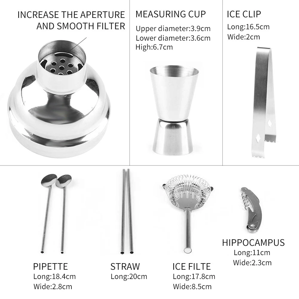1. Высокое качество: Изготовлен из 304 пищевой нержавеющей стали с зеркальной отделкой, ржавчину, царапины и вмятины, подходит для больших объемов баров и домашних баров, рекомендуется дезинфицирующее средство для рук
