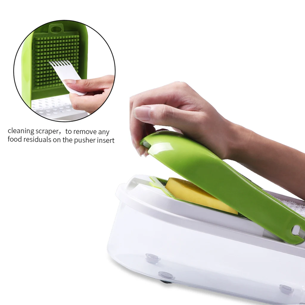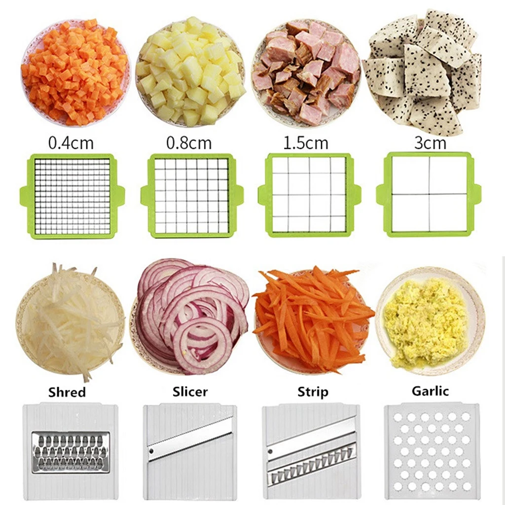 Этот продукт может удовлетворить все ваши потребности, включая измельченные, нарезанные, срезанные цветы, вафли и волнистые разрезы. Есть в общей сложности 8 различных разрезов, начиная с толщины. Пусть это будет хорошим помощником для вашей кухни