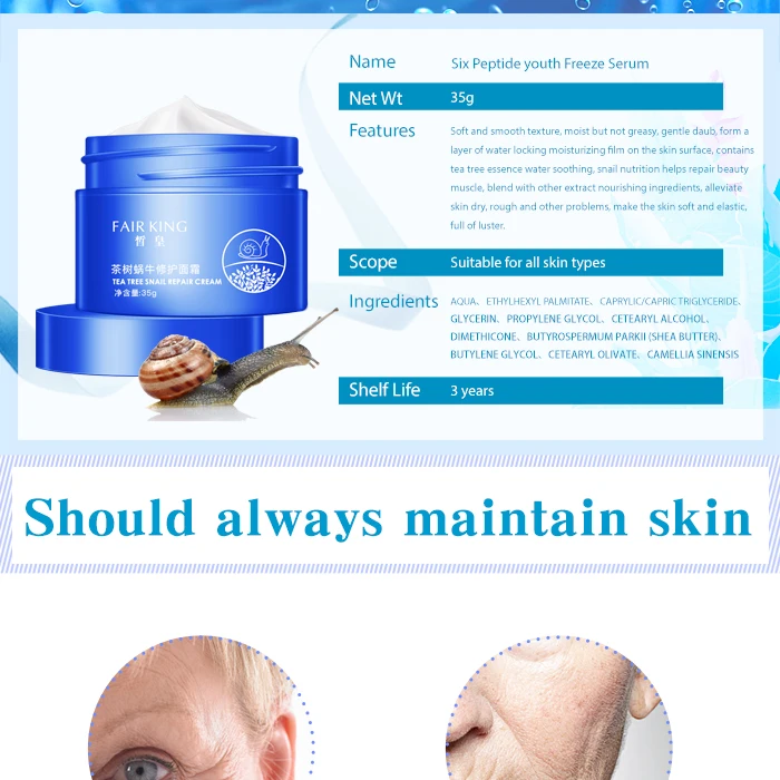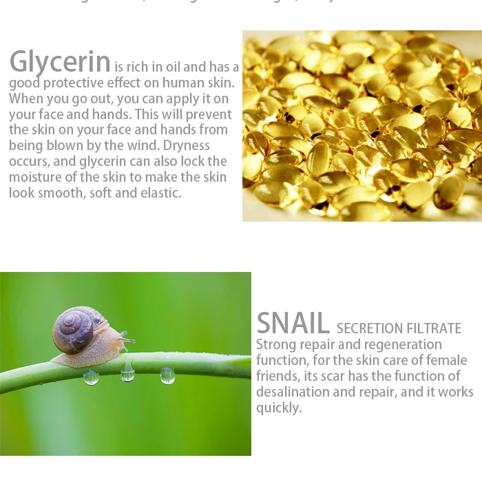 6,Soft and smooth texture, moist but not greasy, gentle daub, form a layer of water locking moisturizing film on the skin surface, contains tea tree essence water soothing, snail nutrition helps repair beauty muscle, blend with other extract nourishing ingredients, alleviate skin dry, rough and other problems, make the skin soft and elastic, full of luster.