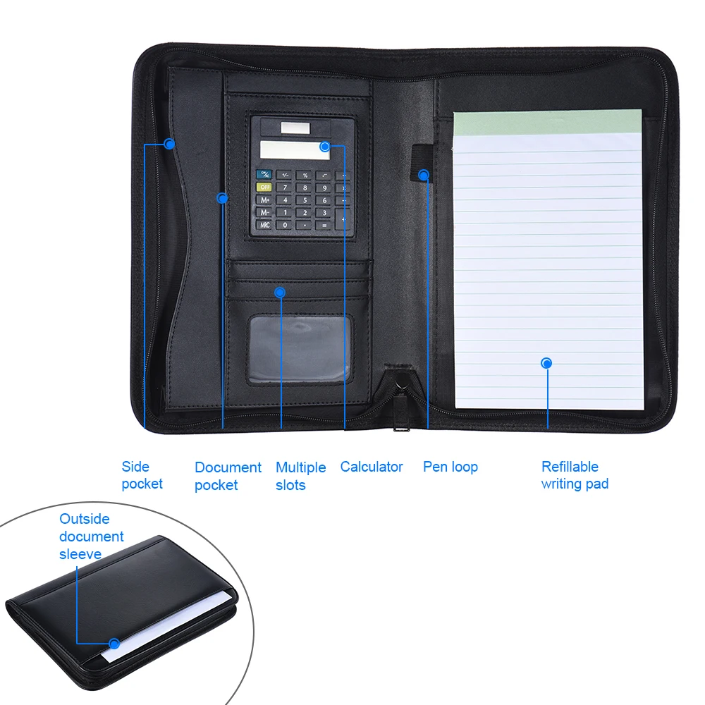 Товар включает в себя только портфель, блокнот и калькулятор, перо и бумагу для файлов не включены.