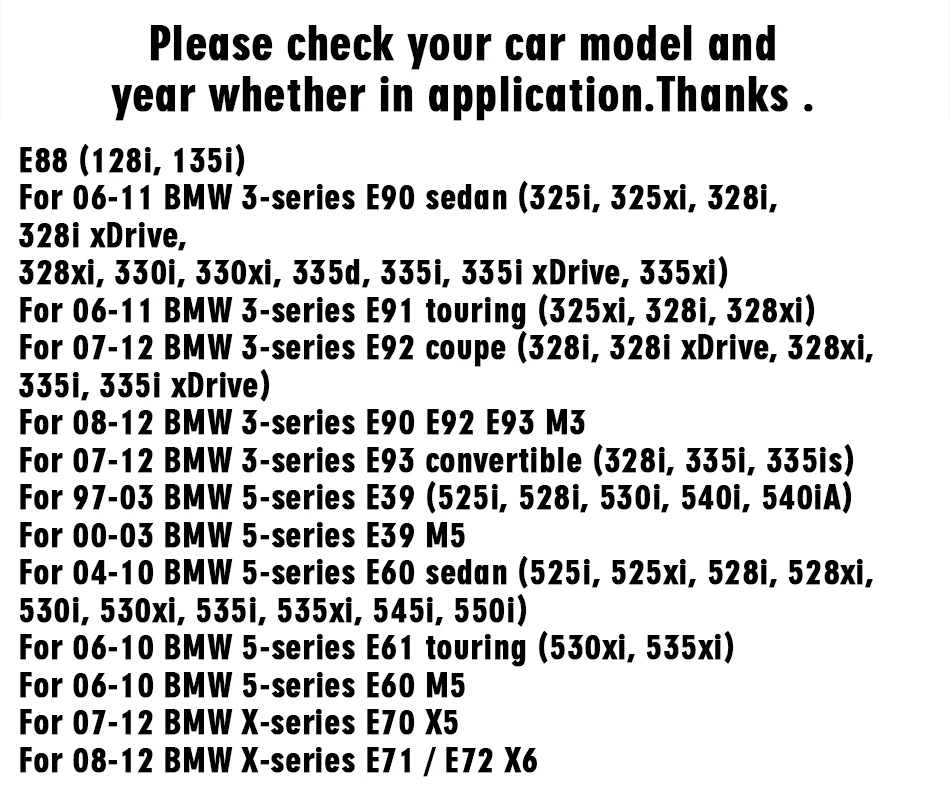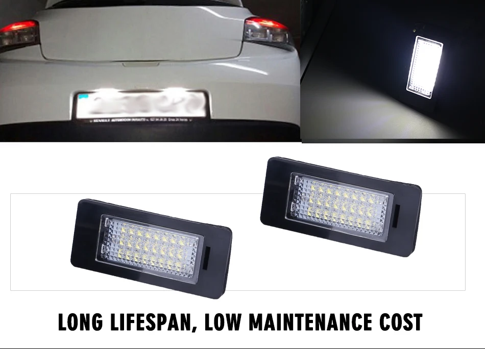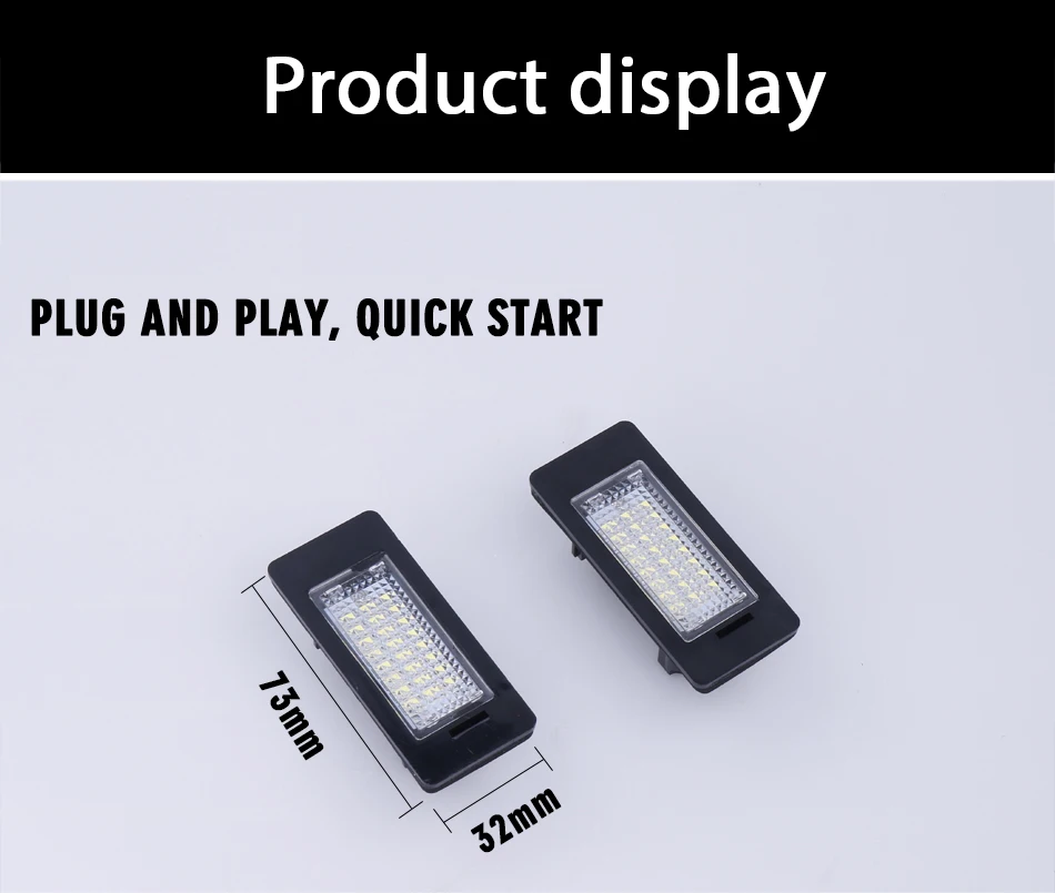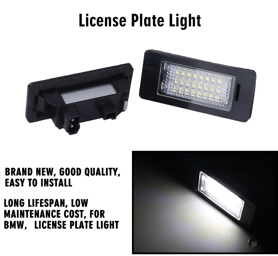 Светодиодный светильник для номерного знака 18SMD высокой мощности Подключи и работай, быстрое мгновенное время запуска Простая установка, прямая замена с OEM качеством и монтажом Светильник белого цвета 6500K Специально разработан без кода предупреждения об ошибках, предупреждающее сообщение, не требуется перепрограммирование компьютера Высокая яркость. Специальная Передняя прозрачная линза для широкого распространения светодиодный светильник Работает для: Для 08-12 BMW 1-series E82 / E88 (128i, 135i) Для 06-11 BMW 3-series E90 sedan (325i, 325xi, 328i, 328i xDrive, 328xi, 330i, 330xi, 335d, 335i, 335i xDrive, 335xi) Для 06-11 BMW 3-series E91 touring (325xi, 328i, 328xi) Для 07-12 BMW 3-series E92 coupe (328i, 328i xDrive, 328xi, 335i, 335i xDrive) Для 08-12 BMW 3-series E90 E92 E93 M3 Для 07-12 BMW 3-series E93 convertible (328i, 335i, 335is) Для 97-03 BMW 5-series E39 (525i, 528i, 530i, 540i, 540iA) Для 00-03 BMW 5-series E39 M5 Для 04-10 BMW 5-series E60 sedan (525i, 525xi, 528i, 528xi, 530i, 530xi, 535i, 535xi, 545i, 550i) Для 06-10 BMW 5-series E61 touring (530xi, 535xi) Для 06-10 BMW 5-series E60 M5 Для 07-12 BMW X-series E70 X5 Для 08-12 BMW X-series E71 / E72 X6 Упаковка продукта: 2 шт. светильник номерного знака