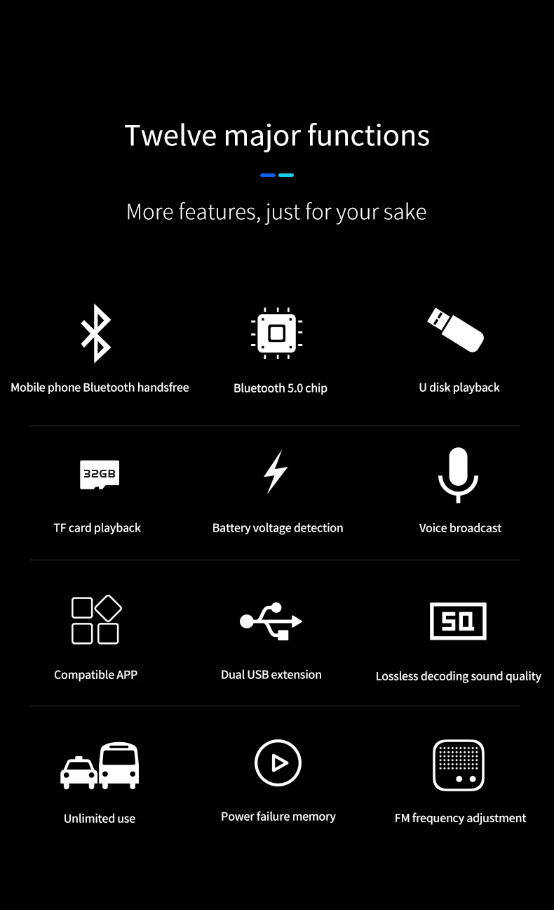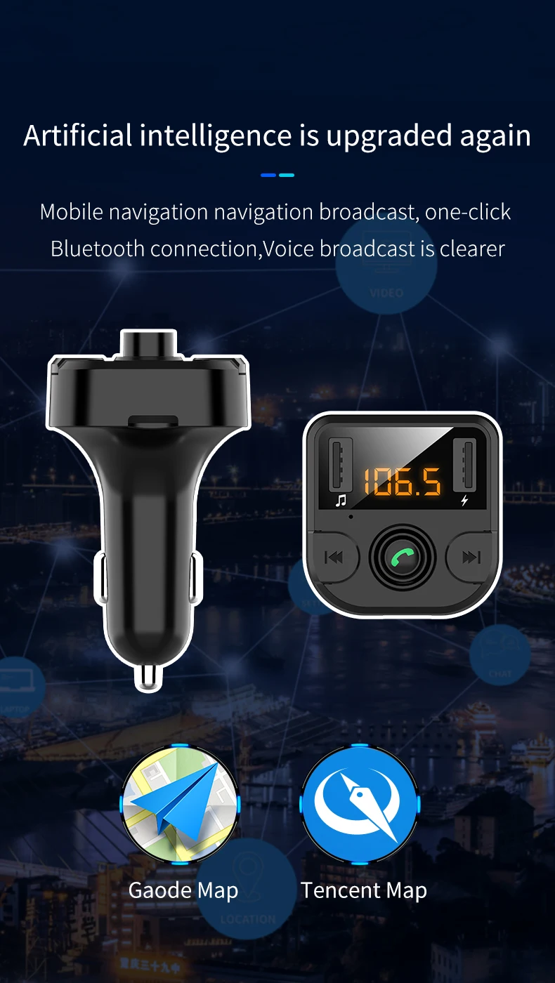 1. Встроенный микрофон, громкая связь и воспроизведение музыки A2DP 2. Переключение в режим громкой связи автоматически от воспроизведения музыки 3. Два usb-выхода 5 В/3.1A 4. Светодиодный дисплей частоты. 5. С голосовыми подсказками 6. Поддержка tf-карты/USB флэш-памяти; 7. Поддержка файлов формата MP3/WMA; 8. Частота: 87,6-107,9 МГц; 9. Индикатор напряжения батареи автомобиля: для проверки состояния аккумулятора автомобиля