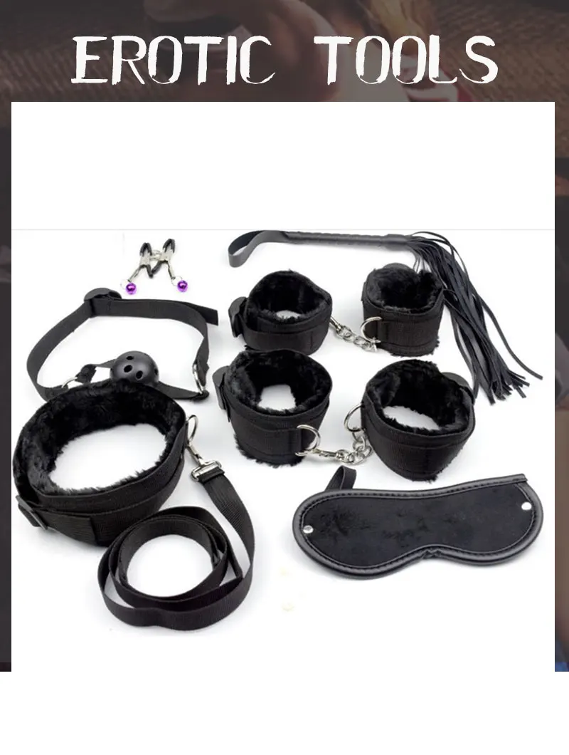 7 шт. для взрослых игр БДСМ секс-игрушки плюшевые лямки наручники и манжеты на щиколотки зажимы для сосков рот вилка флирт бондаж ограничитель эротические аксессуары