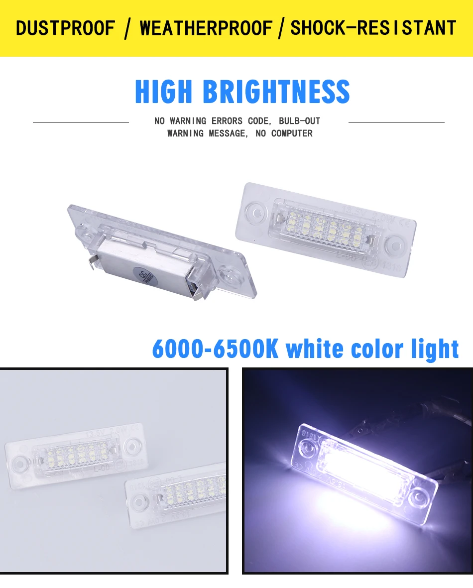 Спецификация: Тип СВЕТОДИОДА: 3528 SMD Количество светодиодов: 18 (на лампу) Цвет светильника: 6000-6500K Характеристика: Он имеет пару мощных беспроблемных светодиодный номерных знаков Каждый светильник номерного знака оснащен 18 светодиодами 3528 SMD, которые производят супер яркий светильник. Прямая установка, без проводки или модификации, просто подключите и играйте. Все модели приложений не имеют ошибок obc. Подходящие модели: Для моделей VW Cadillac MK3 2K ('04 -09) Для моделей Volkswagen (VW) Golf Plus 1K ('05 -09) Для моделей Volkswagen (VW) Jeta / Syncro MK5 1K (A5) ('06 -'10) Для моделей VW Passat 3BG (B5.5) (замена) 4D Sedan ('03 - '05) Для моделей Volkswagen (VW) Passat 3C (B6) 4D sedan ('06 -'08) Для моделей Volkswagen (VW) Touran 1T ('03 -'10) Для моделей Volkswagen (VW) Transporter T5 (Multivan / Caravelle / Eurovan) ('03 -09) Для моделей Skoda Superb MK1 3U (B5) ('02 - '08) (12 / 2001-03 / 2008) Посылка включает в себя: 1 пара светодиодных ламп номерного знака