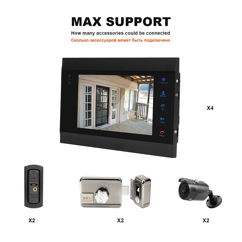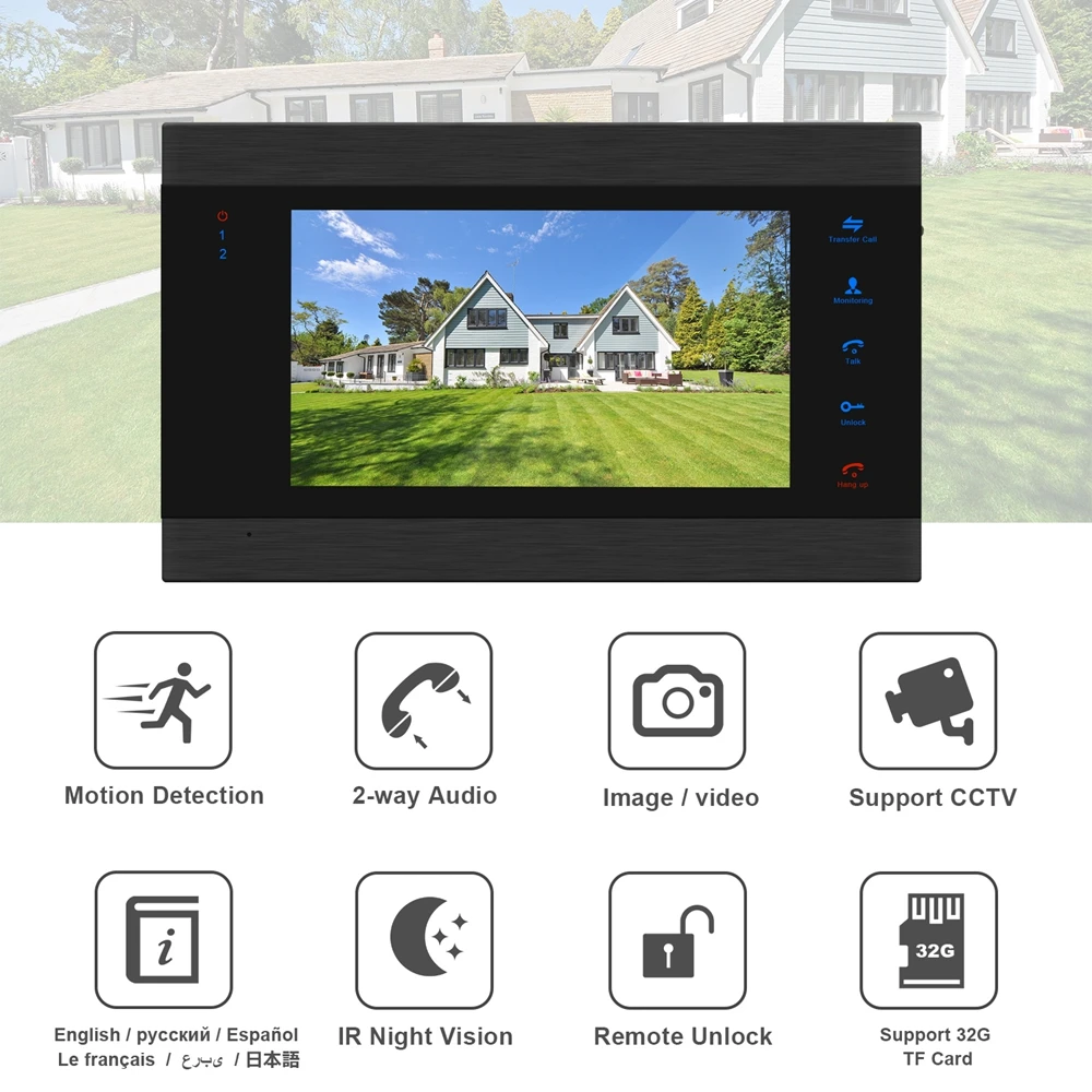 Предоставьте английскую/русскую версию 1. Датчик движения обнаруживает запись видео 2. Двусторонняя Интерком, передача вызовов между мониторами 3. Контроль снаружи без нажатия кнопки вызова дверного звонка 4. 6 языков: английский/русский/испанский/французский/عjapanese/японский 5. Цвет, яркость, Мелодия звонка и регулировка громкости 6. Поддержка аналоговой камеры, подключение электронного замка 7. Поддержка воспроизведения изображений/видео, поддержка внешней максимальной карты памяти 32 Гб 8. Дверной звонок камеры/CCTV камеры предварительного просмотра 9. ИК Ночное Видение 10. intercoms автоматически выключает экран после остановки работы в течение 1 минуты, чтобы сохранить электричество!