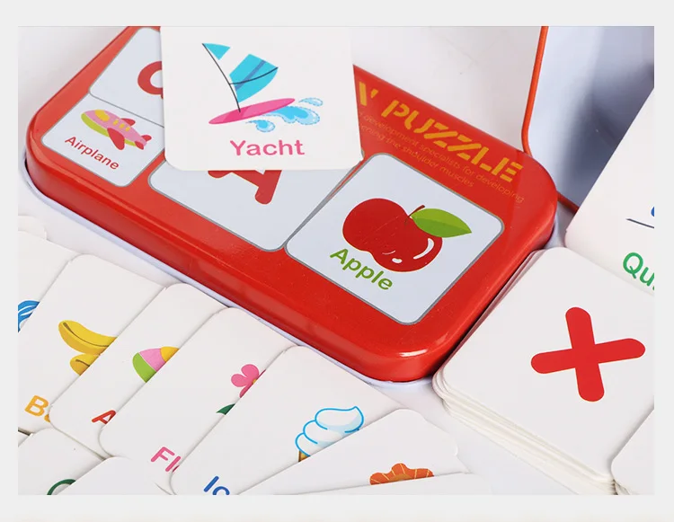 Название продукта: игра-головоломка с железной коробкой Возраст: 12 + месяцев Вес: около 150 г Материал: картон Особенности: -Гладкая, не повреждая руки -Плотный картон, четкий узор, яркий цвет -Белая железная коробка, легко убирать и переносить -Можно выучить английский и китайский языки