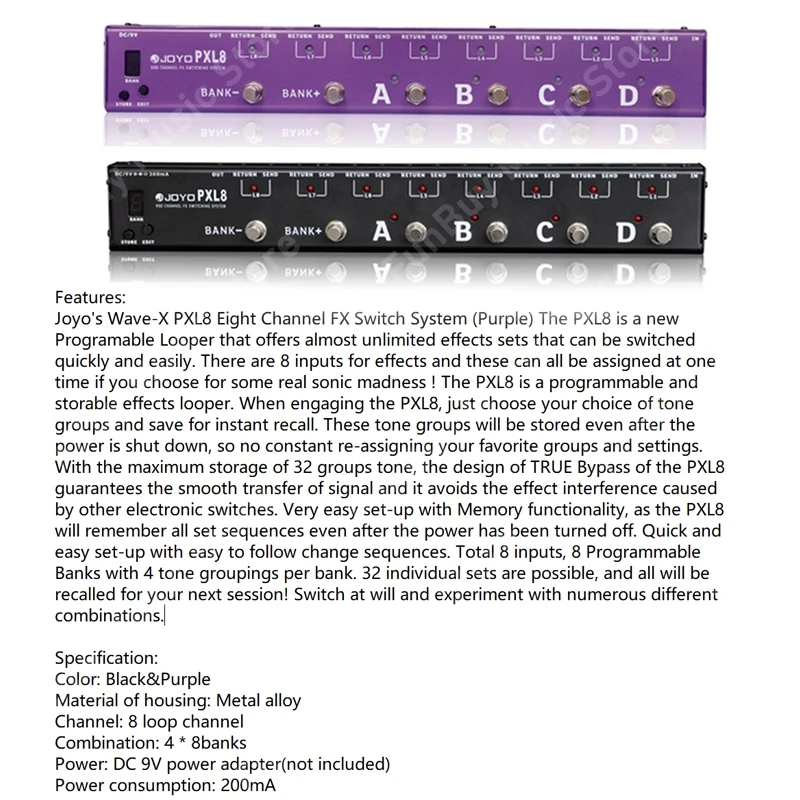Joyo's Wave-X PXL8 8-канальная FX Switch System (фиолетовый) PXL8-это новый программируемый Looper, который предлагает почти неограниченные наборы эффектов, которые можно переключать быстро и легко. Есть 8 входов для эффектов, и все они могут быть назначены в одно время, если вы выберете для какого-то настоящего звукового безумия! PXL8 является программируемым и storable effects looper. При подключении к PXL8 просто выберите свой выбор тональных групп и сохраните для мгновенного отзыва. Эти тональные группы будут храниться даже после отключения питания, поэтому нет постоянной повторной установки ваших любимых групп и настроек. С максимальным объемом памяти 32 групп тон, конструкция истинного обхода PXL8 гарантирует плавную передачу сигнала и позволяет избежать влияния помех, вызванных другими электронными переключателями. Очень простая Настройка с функциональностью памяти, так как PXL8 запомнит все наборы последовательностей даже после выключения питания. Быстрая и простая Настройка с помощью простых последовательностей изменения. Всего 8 входов, 8 программируемых банков с 4 тоновыми группировками на банк. 32 отдельных набора возможны, и все будут отозваны для вашей следующей сессии! Переключитесь по желанию и экспериментируйте с множеством различных комбинаций.