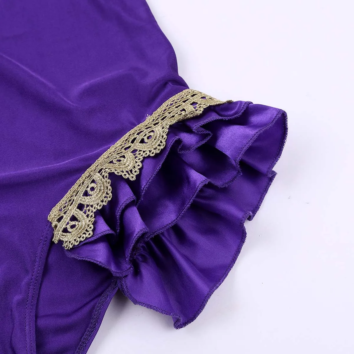 Купальник без рукавов, спереди с v-образной сеткой и золотыми оплетками, сзади также с сетчатыми соединениями, гофрированными отверстиями для ног.