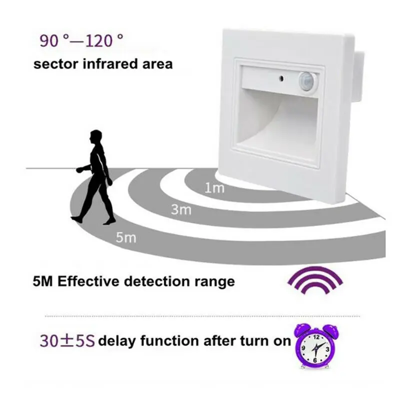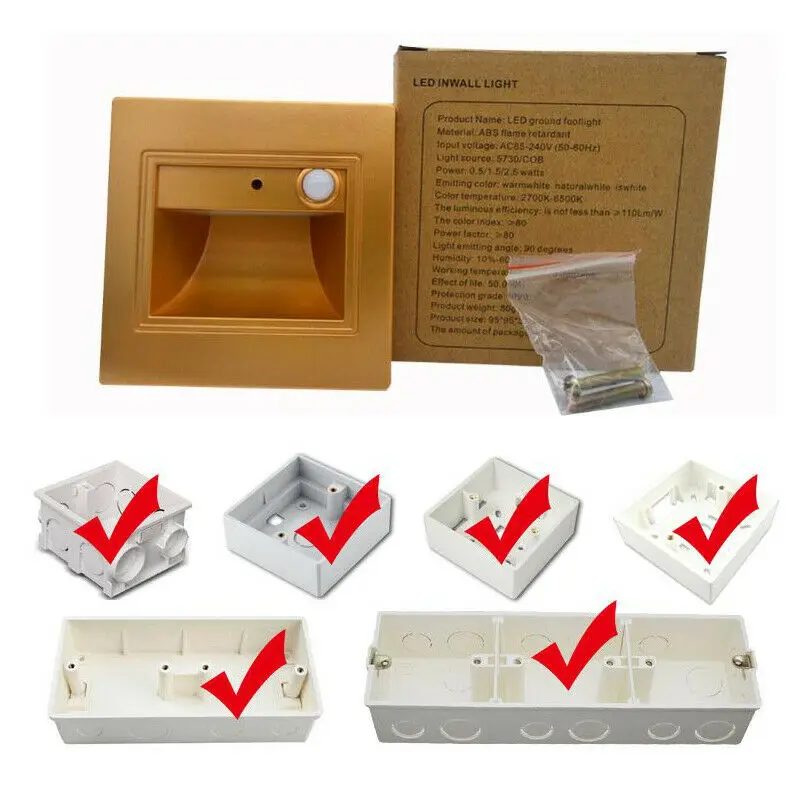 ★Напряжение: 185-240V 50/60Hz ★Мощность: 0,6 W ★Максимальный диапазон чтения: 2-5 м ★Угол индукции: 90 °-120 ° ★Когда вокруг будет темно, он включится. ★Когда вокруг светильник, он выключится. ★Инфракрасный датчик: Индукционная зона в форме вентилятора. ★Когда вы находитесь в этой зоне, лампа включится автоматически. ★Когда вы уедете, он выключится ★(Чип на плате) Срок службы: 50000H ★Светильник Цвет: холодный белый (6000-6500K) /теплый белый (2700-3500K) ★Цвет корпуса: белый, серебристый, черный, золотой ★Материал: АБС-пластик + алюминий + светодиодный ★Размер изделия: 95*95*32 мм ★Установка: встроено в Посылка включает в себя: 2x0,6 Вт светодиодный лестницы Светильник