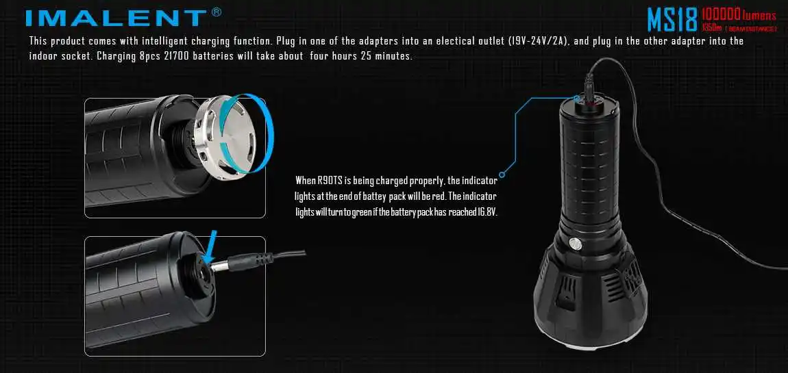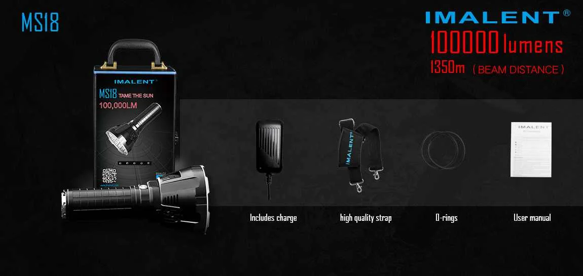Название продукта: Imalent MS18 светодиодный фонарик Торговая марка: Imalent Модель: MS18 Излучатель Тип: 18x XHP70 Pe.ak луч Inten.sity: 458000cd Макс Выход: 100000 люмен Диапазоны: 1350 метров Режим: TURBO/высокая Ⅲ/высокая Ⅱ/высокая Ⅰ/средний Ⅱ/middleⅰ/средний низкий/Низкий Световой поток: TURBO: 100000-25000lm