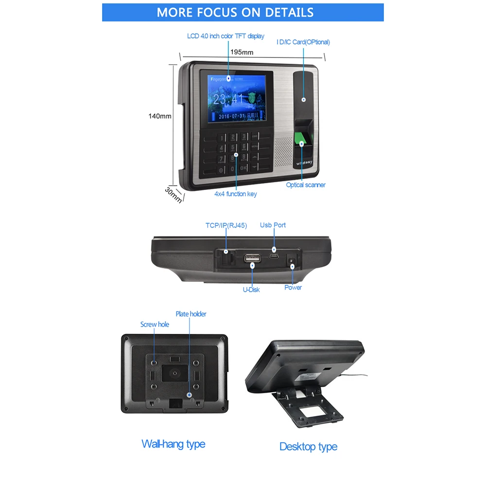 Эта машина предназначена для проверки посещаемости с помощью отпечатков пальцев и пароля и подходит для офиса, фабрики, отеля, школы, ресторана, розничного магазина, больницы.