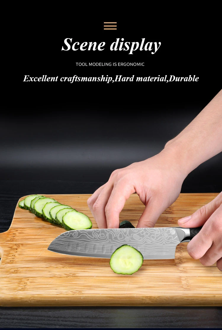 Свойство: экологичная Тип ножа: ножи Santoku Материал: Германия 4116 нержавеющая сталь Размер: 1. Общая длина: 33,5 см 2. Длина лезвия: 20,5 см 3. Вес нетто ножа: 237 г В комплект входит: 1 нож (в коробке) Примечание: 1. Материал этого ножа-Германия 4116 нержавеющая сталь, это не дамасский стальной нож. 2. Зерно лезвия ножа-лазерные Вены.