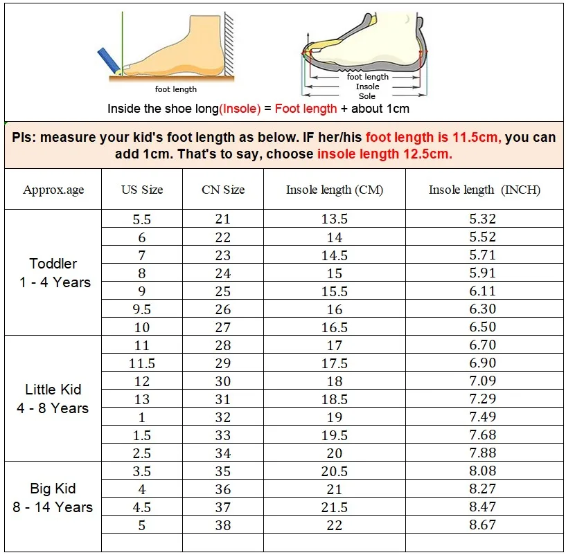 5.Что касается размера, Измерьте длину стопы ребенка в см или дюймах + 1 см или 0,03937 дюймаChВыберите соответствующий американский размер, спасибо