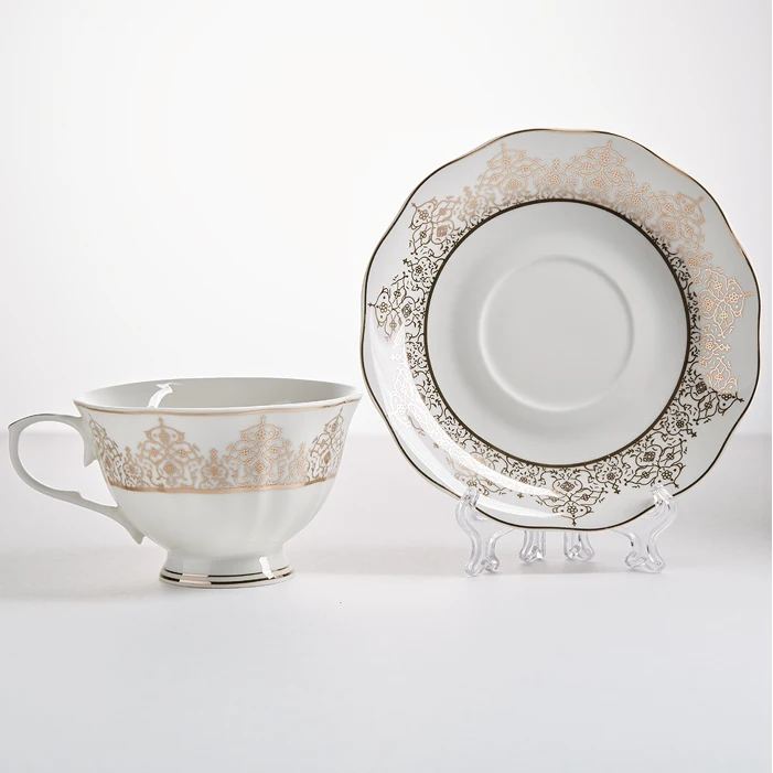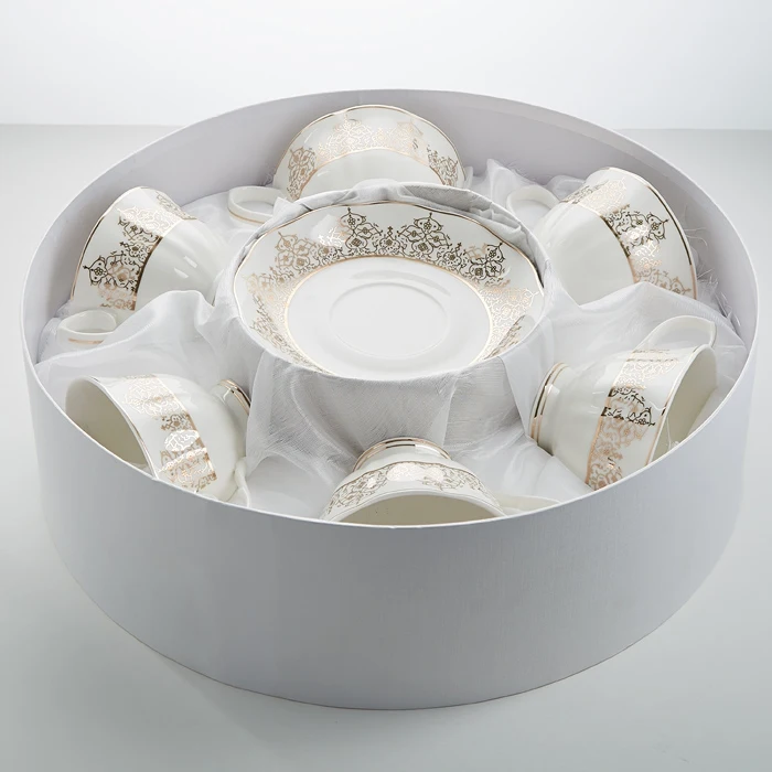 Набор чайный из высококачественного фарфора с декоративным рисунком и золотой обводкой на 6 персон. Упакован в цветную подарочную коробку.