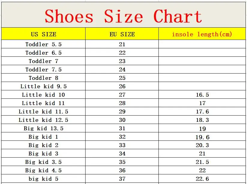 Дорогие друзья: Поскольку все размеры детской обуви отличаются, при заказе детской обуви вы должны соответствовать нашим размерам и внутренней длине. Согласно длине стельки. (длина стельки = длина стопы + 1 см) американский размер не стандартный, просто удобный для вас, чтобы сделать заказ. Удобная длина-это длина стопы, добавляющая около 1 см. И в связи с длительным сроком доставки Авиапочта Китая и ребенок быстро вырастет, пожалуйста, выберите обувь большего размера для вашего ребенка. Пожалуйста, выберите правильный размер. Вся обувь будет отправлена с пузырчатыми сумками, без коробок!