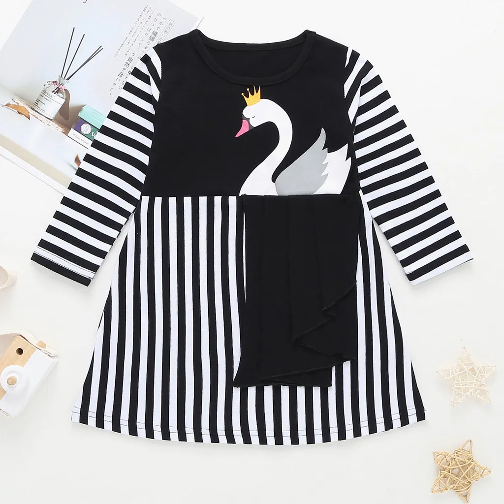 Милые платья для маленьких девочек; платье принцессы с длинными рукавами и оборками в полоску с изображением короны и лебедя для маленьких девочек