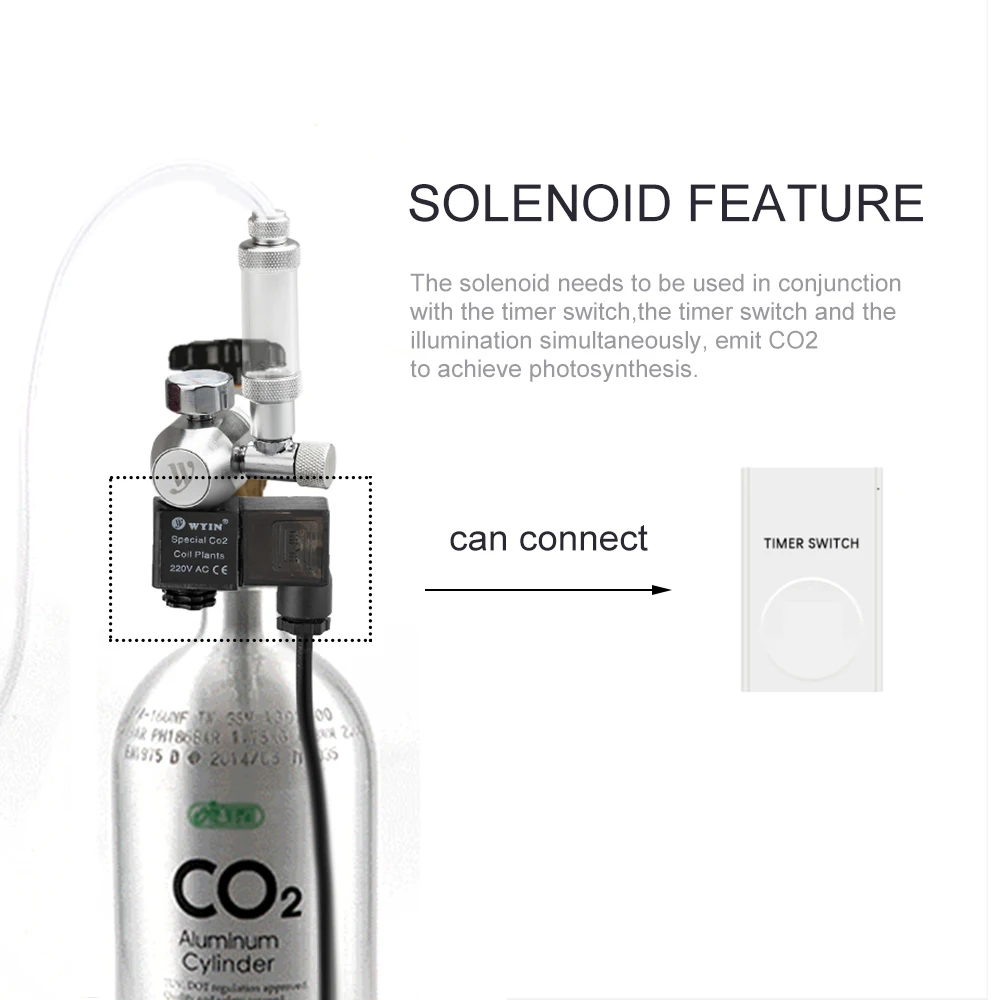 Электромагнитный клапан: для управления включением и выключением системы генератора CO2 с помощью таймера (не входит в комплект). 100-240 в широкий вход напряжения, выход постоянного тока 12 В, Соленоидный клапан 12 В бесшумная версия.