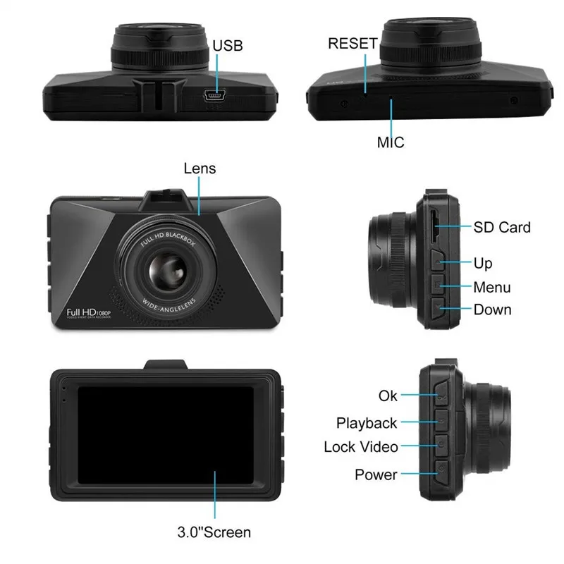 Ключ Особенности 1. Патентный дизайн, индивидуальная оснастка 2. 1080 P FHD 3. 3,0 дюймовый HD экран 4. G-сенсор 5. Функция обнаружения движения 6. Циклическая запись Recordering 7. Мониторинг парковки