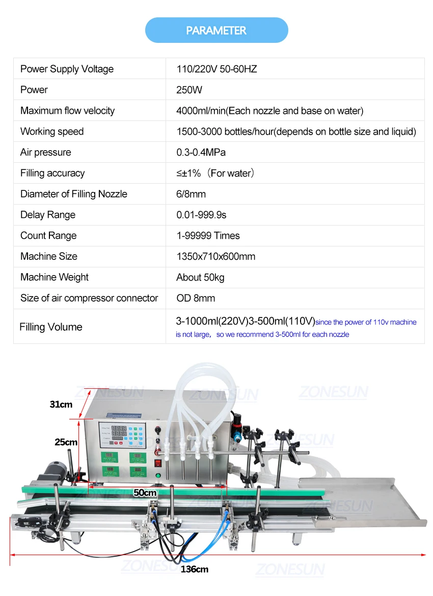 3-1000 мл (220 В) 3-500 мл (110 В), так как мощность машины 110 В не большая, поэтому мы рекомендуем 3-500 мл для каждого сопла