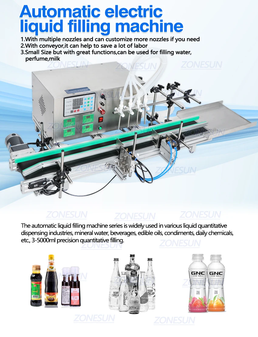 Автоматическая машина для розлива жидкости широко используется в различных количественных отраслях, таких как минеральная вода, напитки, пищевые масла, приправы, ежедневные химические вещества и т. д.