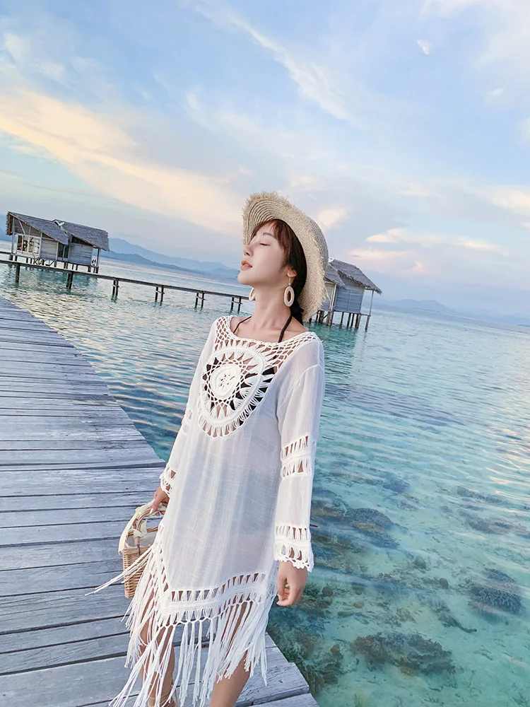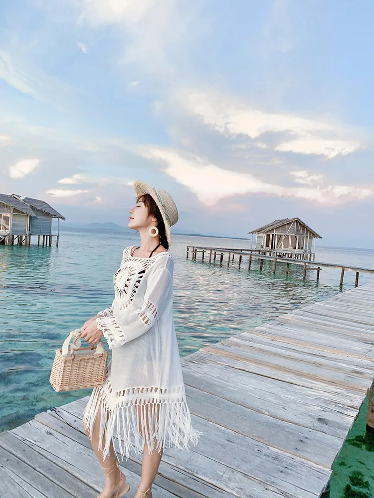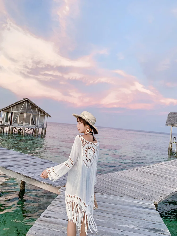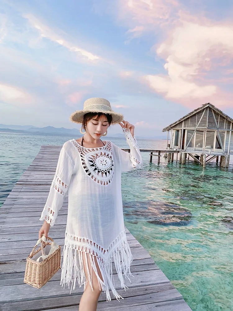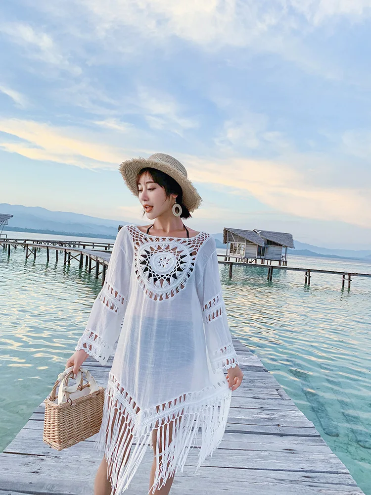 Новое поступление 2022, Пляжное Платье-парео с кисточками, женское бикини, летнее открытое пляжное платье с длинным рукавом, белый купальник, Vestido