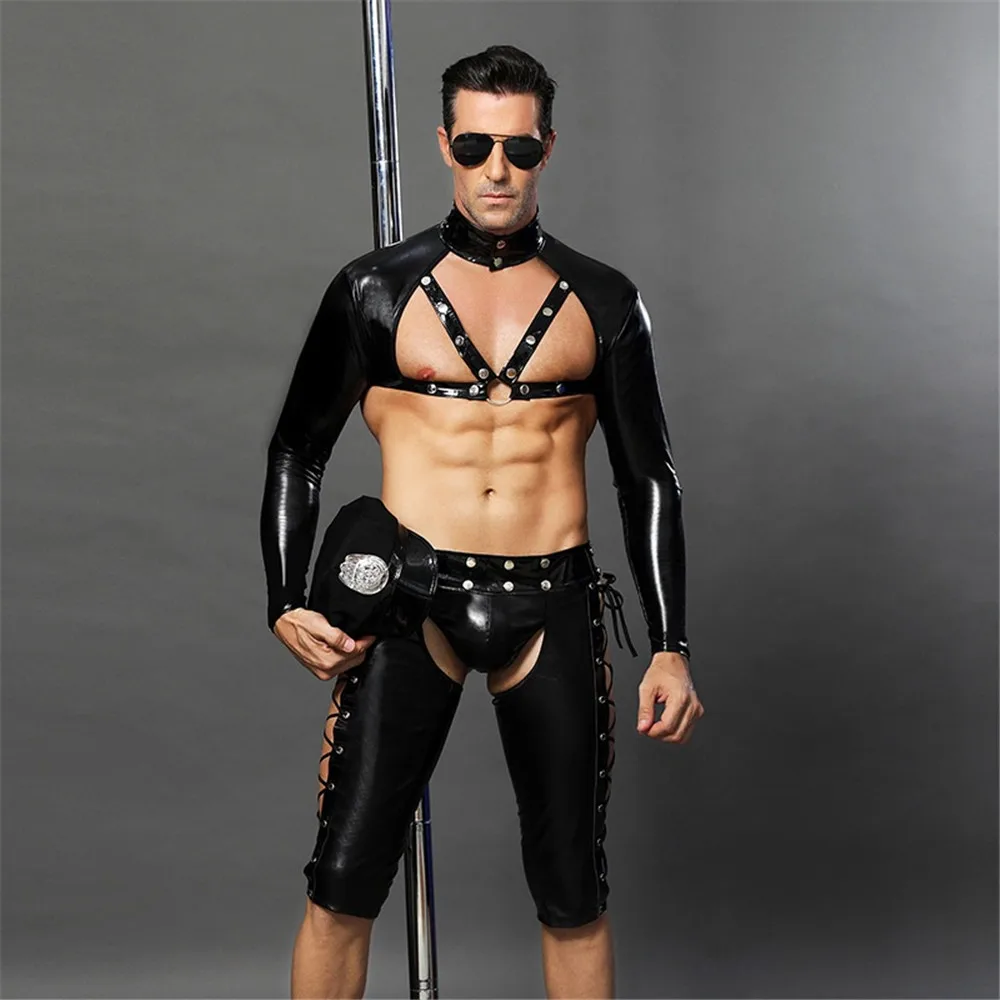 Комплект из 4 предметов, сексуальный мужской костюм из искусственной кожи, облегающее боди сексуальное нижнее белье, нижнее белье, костюмы для костюмированной вечеринки