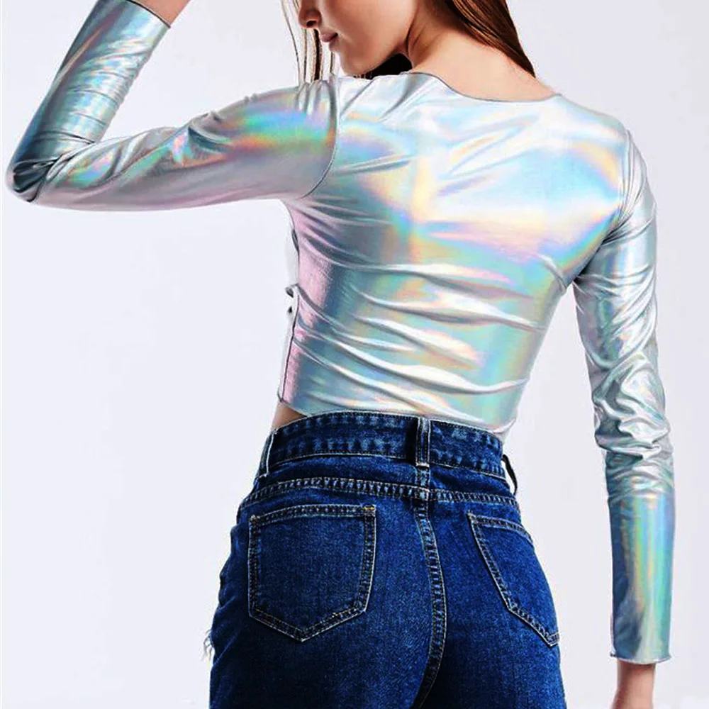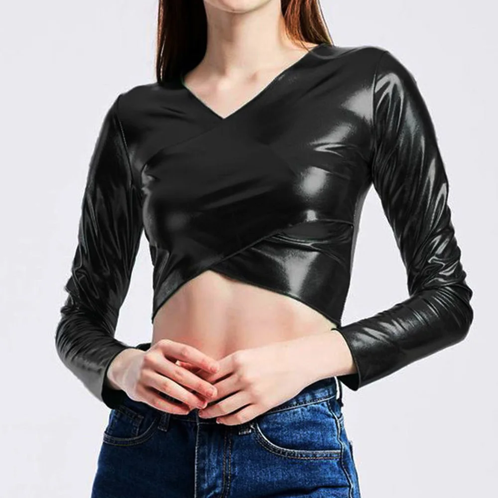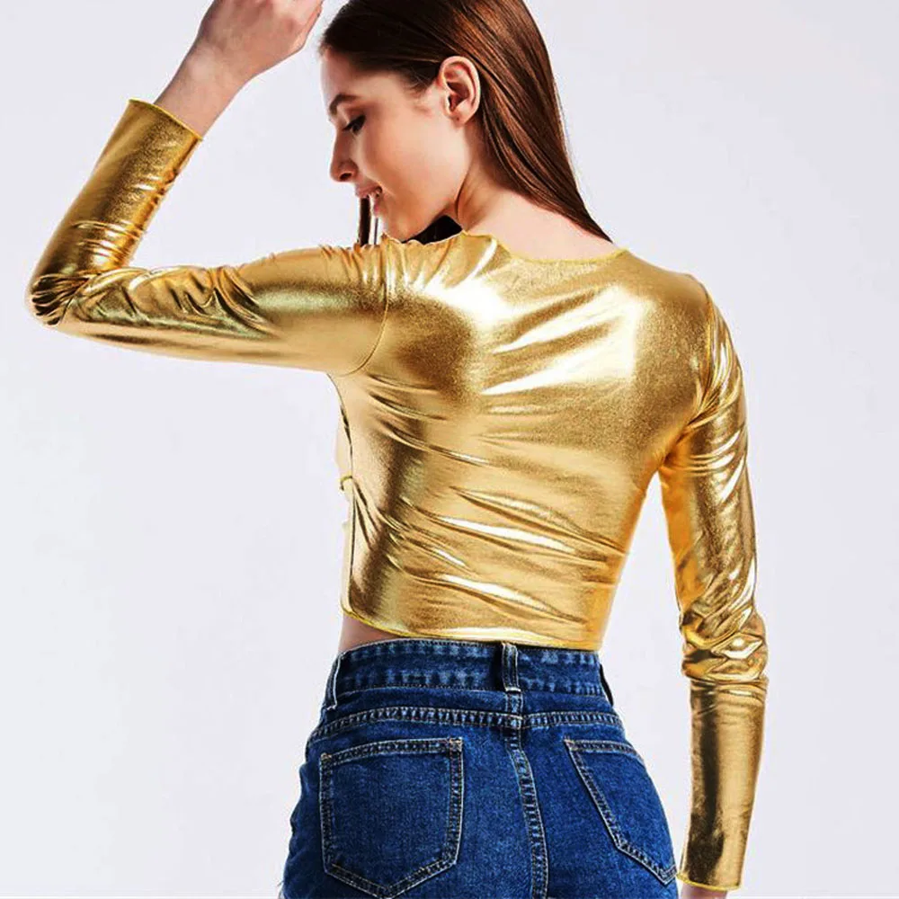* Кроп Топ Размер: S/M/L/XL/2XL Плюс Размер Топы * Сексуальные топы цвет: черный, золотой, серебряный, зеленый, красный (как на картинке) * Качество летней блузки: высокое качество * Женские топы с на 100% абсолютно новый * Женские топы Описание: металлический короткий топ с длинными рукавами женская золотая панк водолазка голографическая Футболка Обрезанные Топы Для клубного танца Wet Look Базовая футболка * Содержимое упаковки: только 1 Топ (аксессуары в комплект не входят)