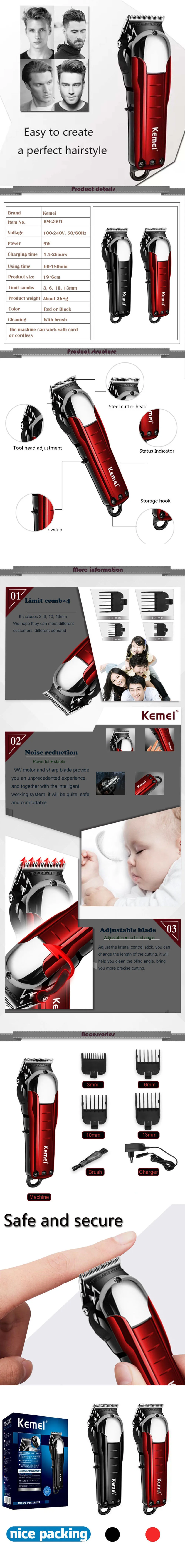 Бренд: Kemei Модель: km-2608 Цвет: красный, черный Тип: машинка для стрижки волос Мощность: 9 Вт Мощность: аккумуляторная батарея Напряжение: 100-240 В Вес нетто: 280 г Размер продукта: 19*5,5 см Размеры Упаковка: 219*81*286 мм Вспомогательное оборудование продукта: Хост-машина Щетка Зарядное устройство Предел гребень * 4 Внимание: Обратите внимание: картина маслом бутылок для газированных напитков составляет не прилагаются, потому что правилам воздушной перевозки не транспортировки жидкостей. Имейте это в виду.