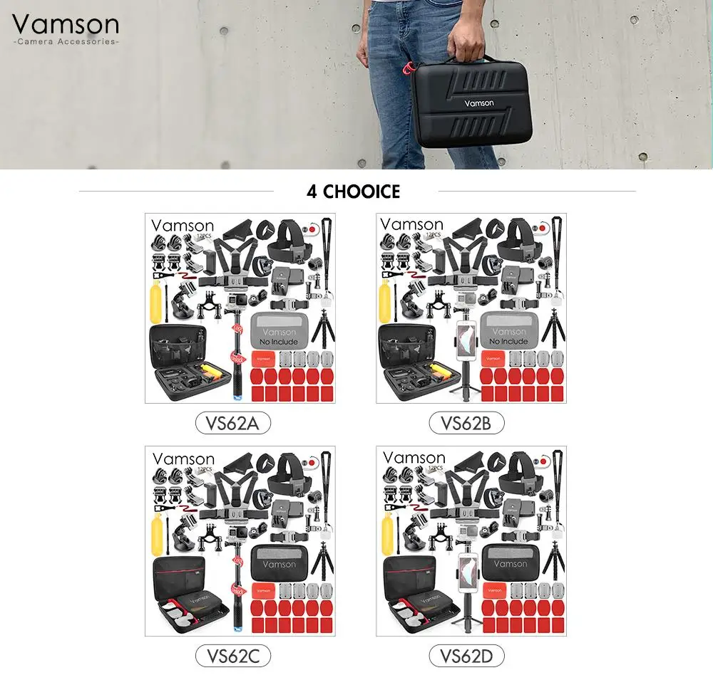 Часто задаваемые вопросы: для каких экшн-камер подходит? A: совместимость для gopro hero 7 6 5 4 3 2 1/для Xiaomi yi 1/yi 2 /yi 4k/yi 4k +/yi lite/для SJCAM SJ4000 SJ5000 SJ6000 SJ7000/для экшн-камера DJI OSMO/для EKEN/SOOCOO/SONY и большинства экшн-камер Q: В комплект входит камера? A: не включает камеру/дистанционный пульт/водонепроницаемый корпус чехол несколько вариантов доступны Что входит в комплект VS62A / VS62B ----- от сумкой VS62C / VS62D ----- новая сумка для переноски