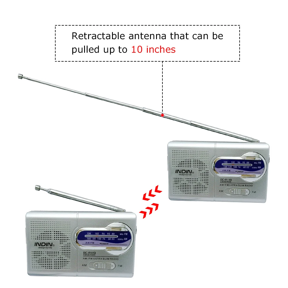 *The radio has a retractable antenna that can be pulled up to 10 inches and manually adjusts the signal of the radio to enhance signal acceptance.