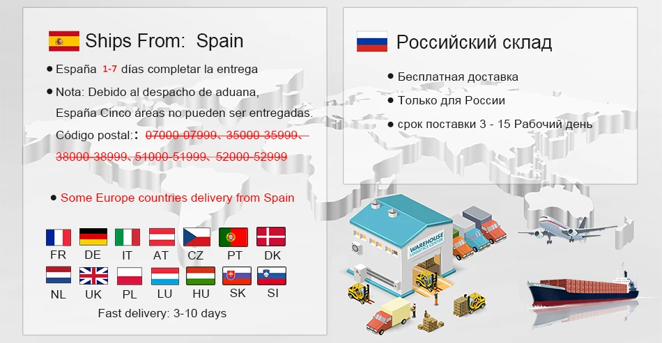 О русском складе и складе Испании? ● Идеальная страховка, каждый качественный товар ● Примечание: Португальский почтовый индекс 9000-9999 области не может быть доставлен. Debido al despacho de aduanas,Cinco regiones de españa No se puede entregar. Código почтовый: 07000-07999, 35000-35999, 38000-38999, 51000-51999, 52000-52999 Пожалуйста, обратите внимание на пункт назначения при заказе! Мы сожалеем о любых неудобствах.