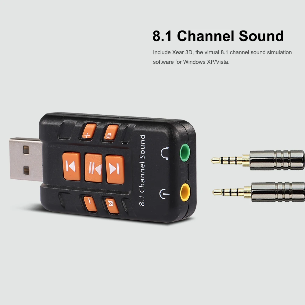 The USB Virtual 8.1 Channel Sound Adapter is a highly flexible audio interface which can be used either with Desktop or Notebook systems. Bundled with Xear 3D Sound simulation software, it turns your stereo speaker or earphone into 8.1 channel environment. No driver required, just plug and play for instant audio playback, also compatible with all major operation system.