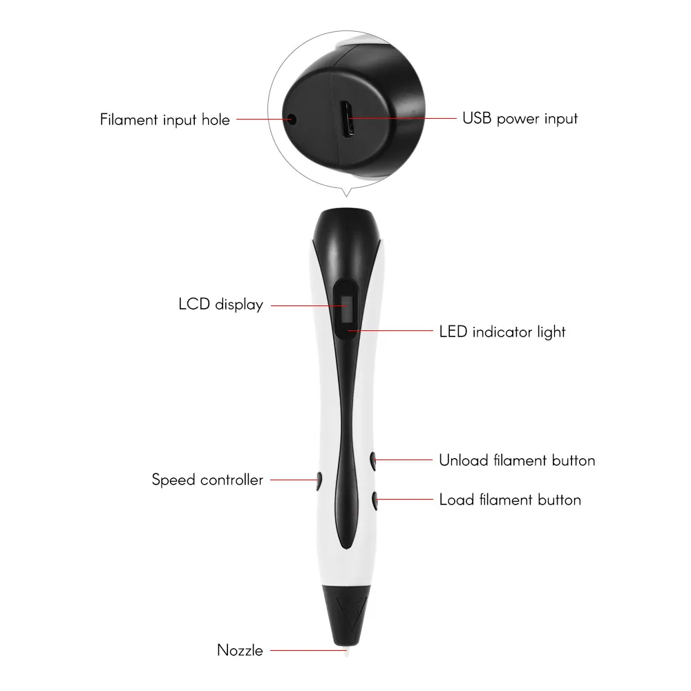 [Дизайн безопасности]:Питание осуществляется через usb-кабель, он может быть подключен к вашему блоку питания/ПК/штепсельному адаптеру. Устройство автоматически войдет в режим сна, если оно не используется более 3 минут. Поставляется с подставкой для ручки, чтобы безопасно держать 3d-ручку, и 2 пальца киоски, чтобы избежать ожогов пальцев.