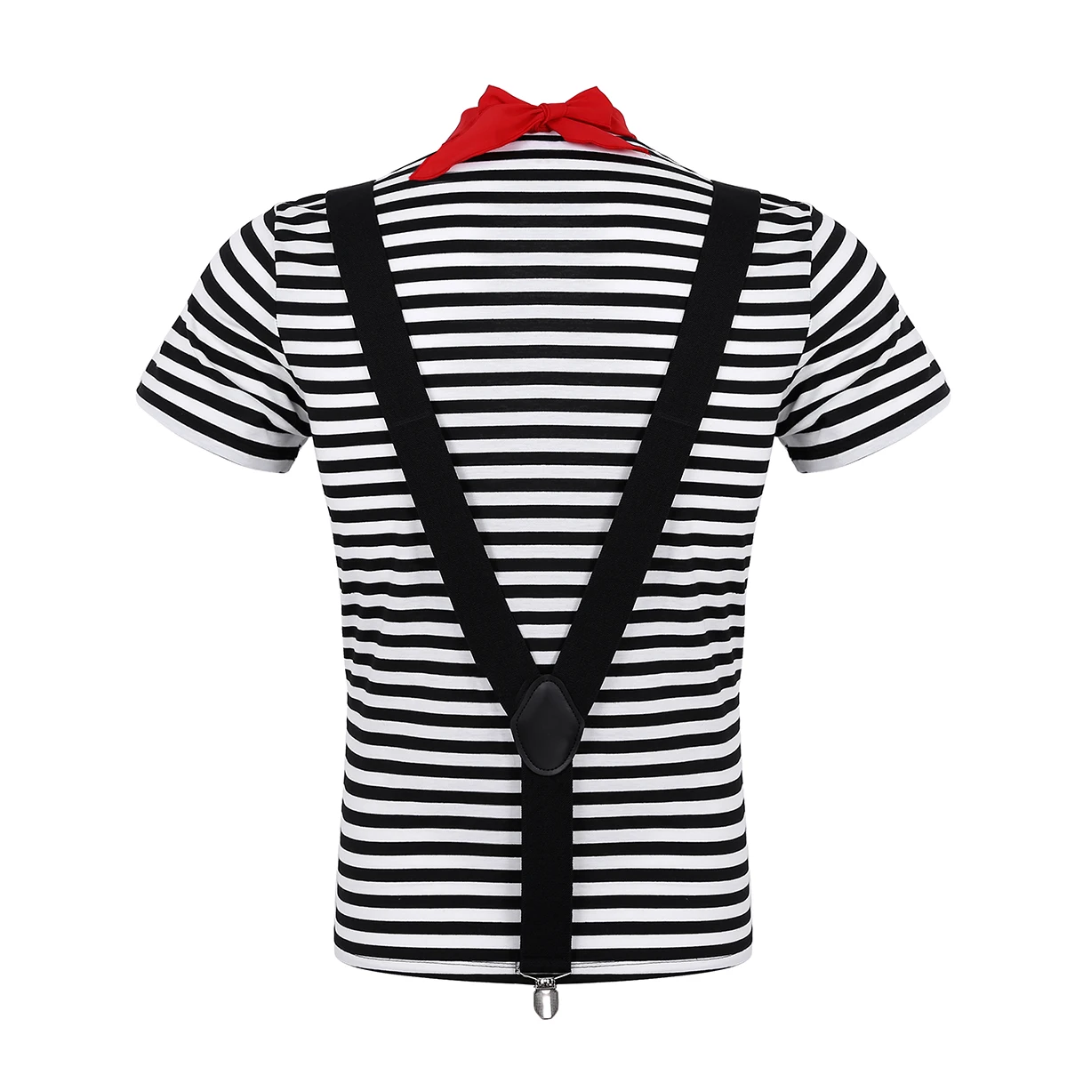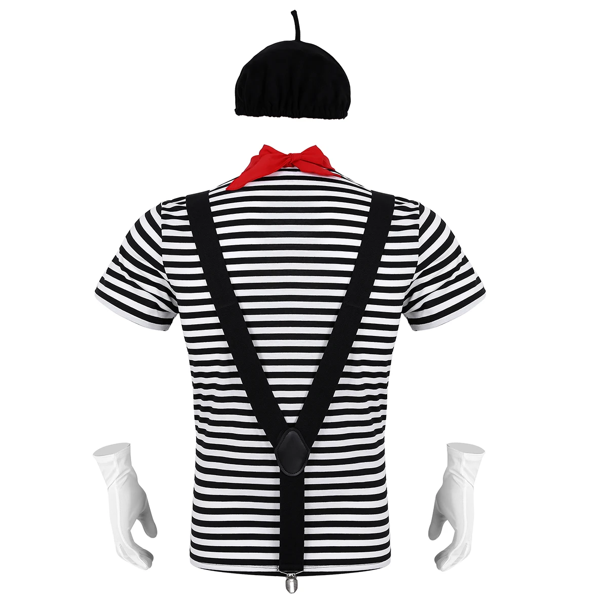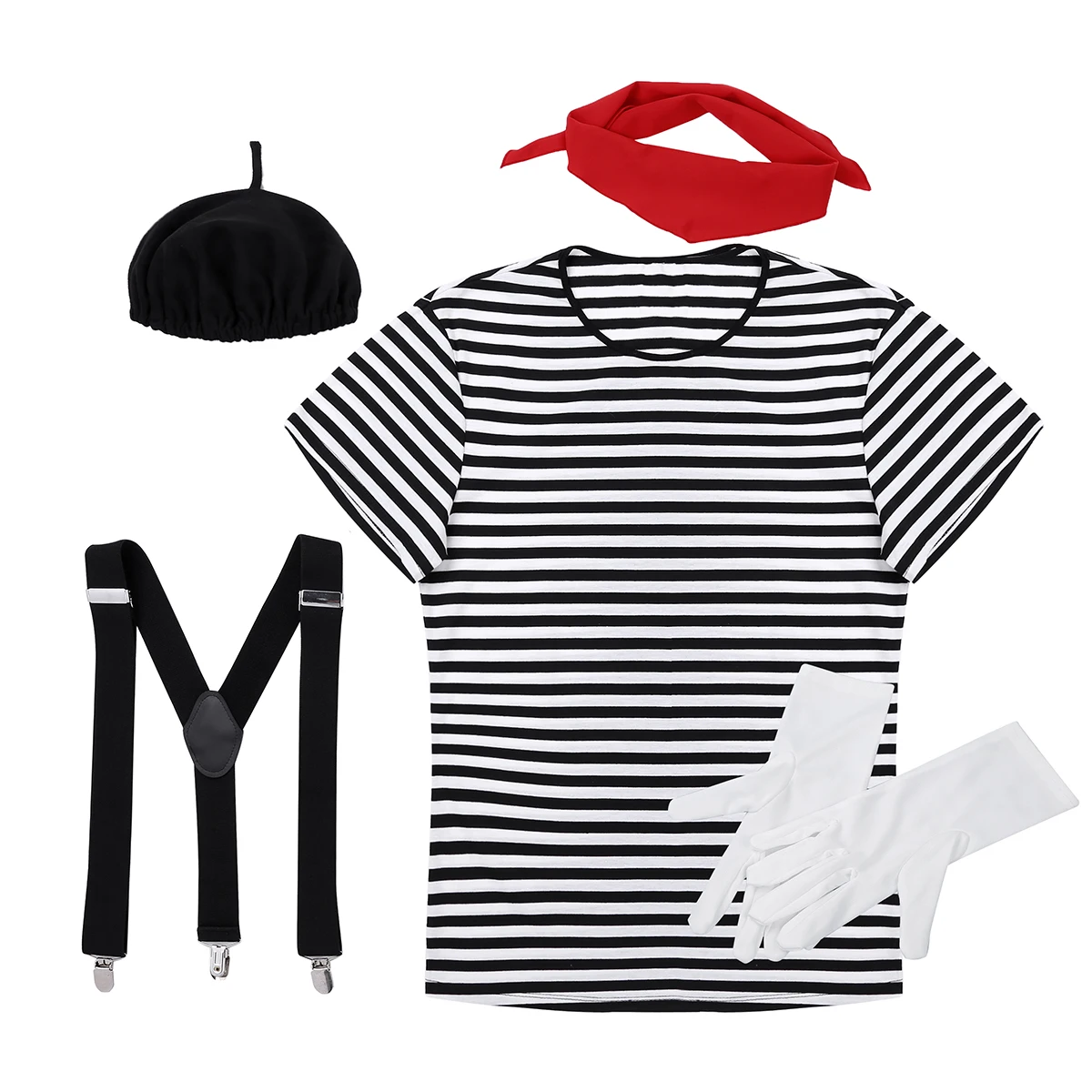 В комплект входит: 1 футболка, 1 берет, 1 красный шарф, 1 подтяжки, 1 пара перчаток