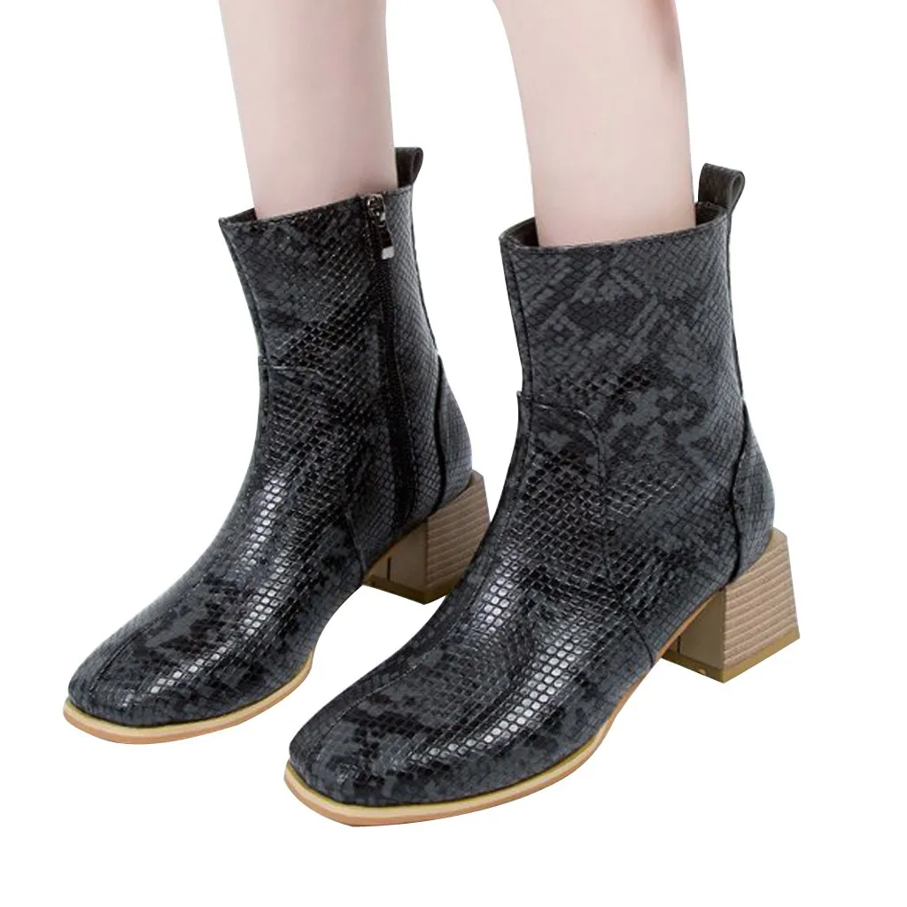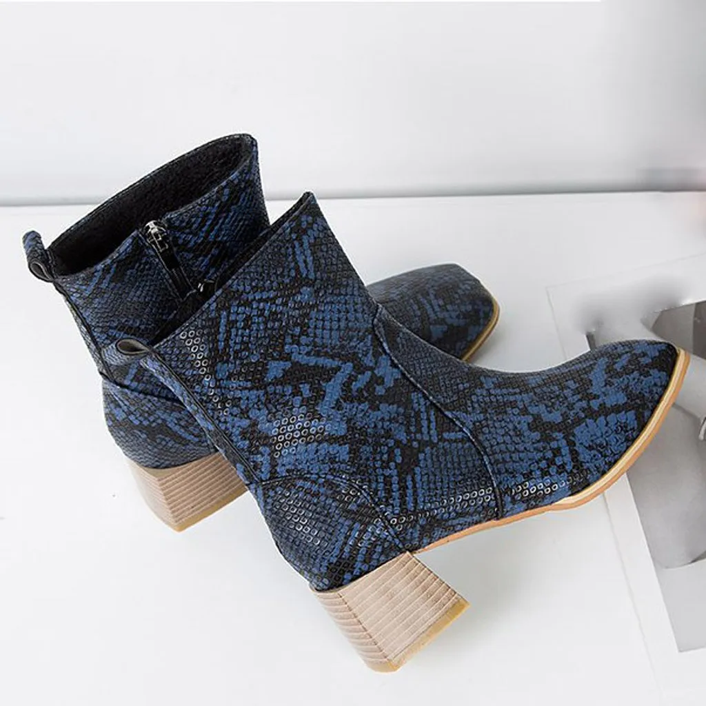 Модные женские ботинки из змеиной кожи на квадратном каблуке; ботинки на молнии; змеиная обувь на толстом каблуке