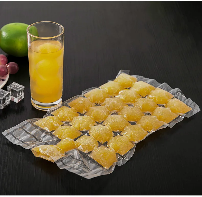 Еда PE. Само-запечатывание и одноразовые мешки для льда, он включает в себя 10 небольших мешков, одна маленькая сумка может сделать 24 кубика льда. Таким образом, с этими сумками вы получите 240 кубиков льда в общей сложности.
