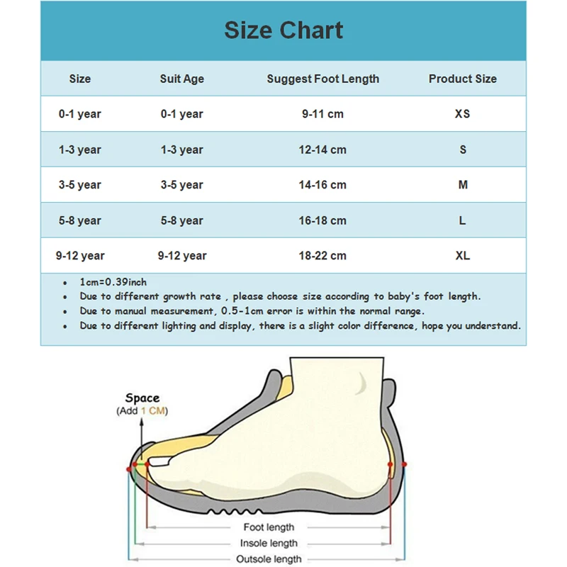 Если вам нужен размер XL для ребенка 9-12 лет, пожалуйста, оставьте нам сообщение в своем заказе Размер XL для детей 9-12 лет, подходит для стопы длиной 18-22 см