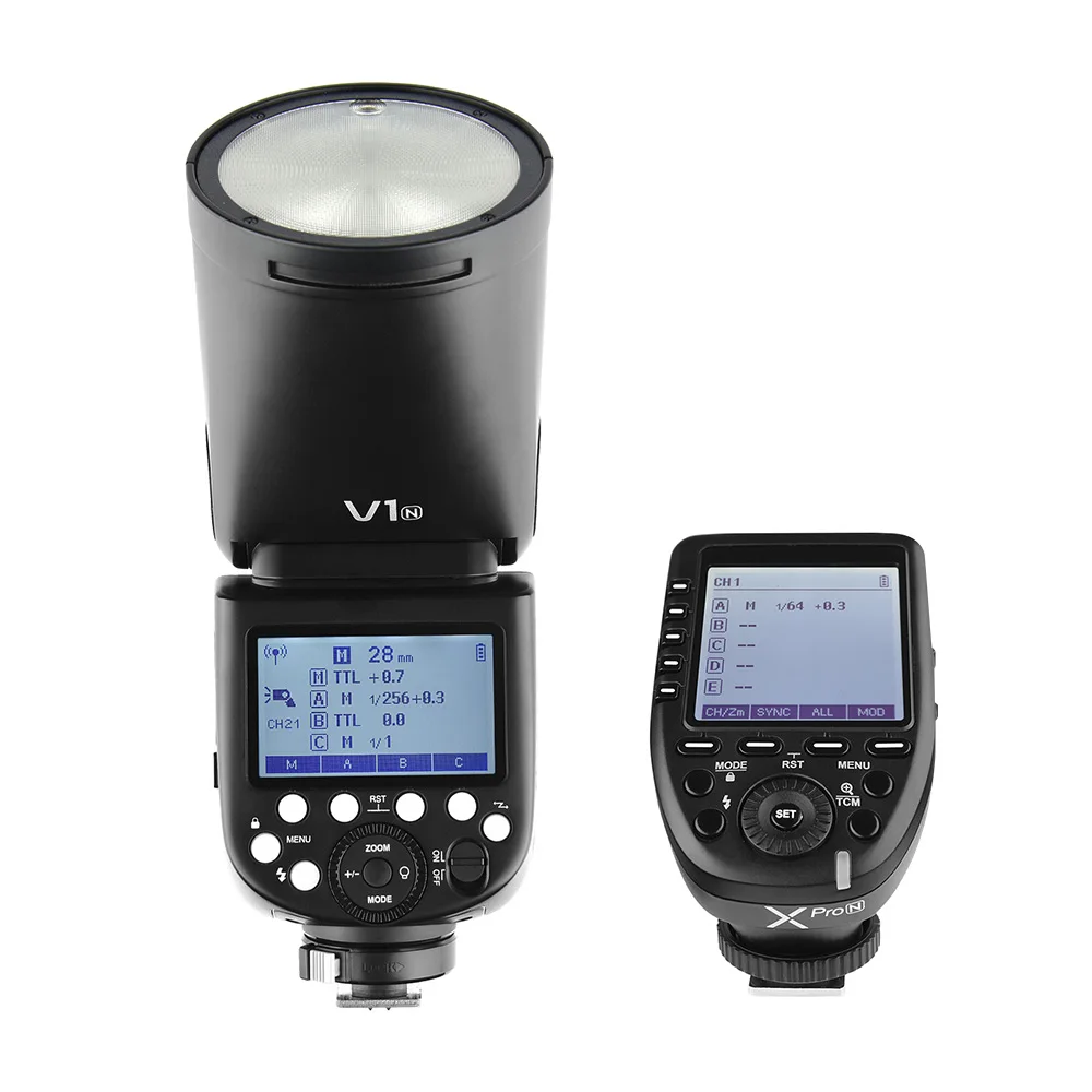 Профессиональная вспышка Godox V1N для камеры speedlite (версия Nikon), круглый светильник с головкой, равномерное и мягкое освещение, отличное стереовоззрение, обеспечивают вам Необычные фотографические эффекты. Поставляется с Godox Xpro-N i-ttl беспроводной флэш-триггер передатчик, может контролировать speedlite идеально.