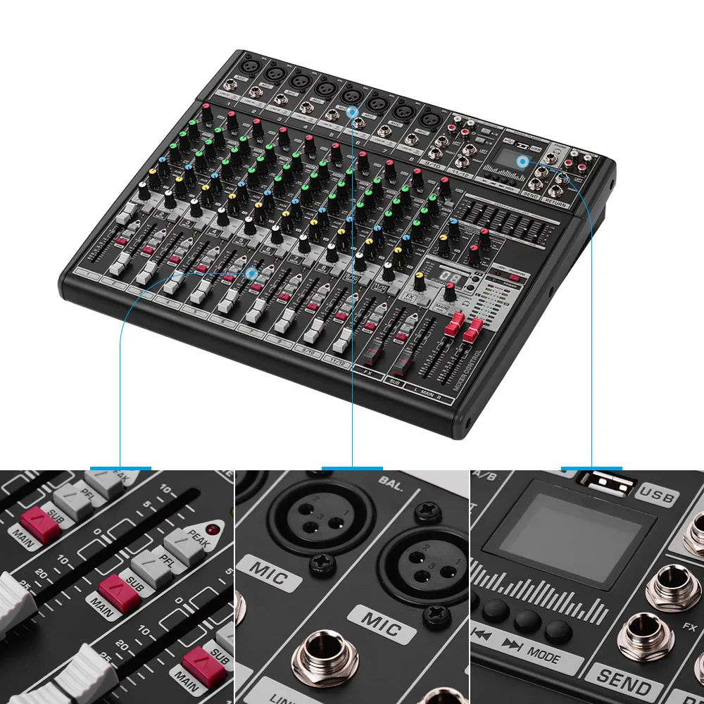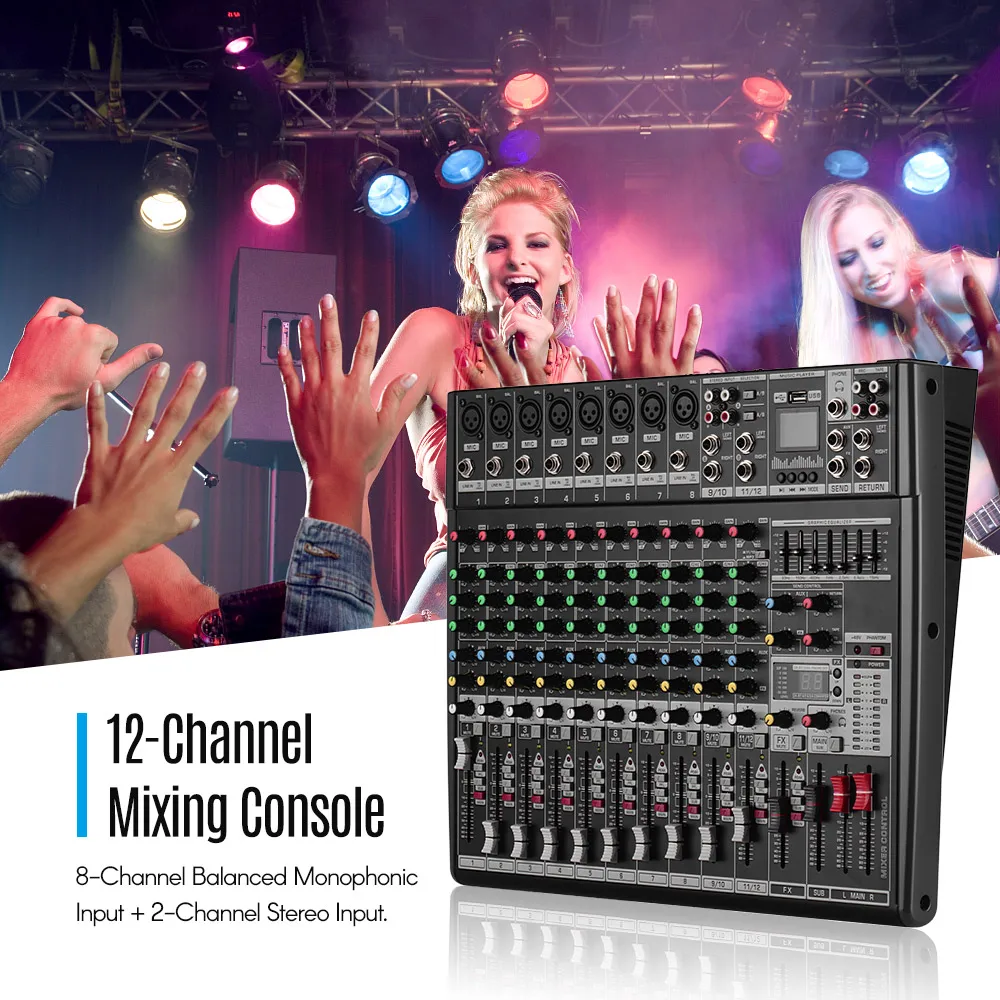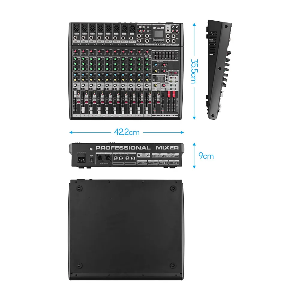 Встроенный микрофон + фантомный источник питания 48 В; 16 видов цифровых эффекторов DSP; Основной выход стерео поставляется с 7-сегментным эквалайзером.