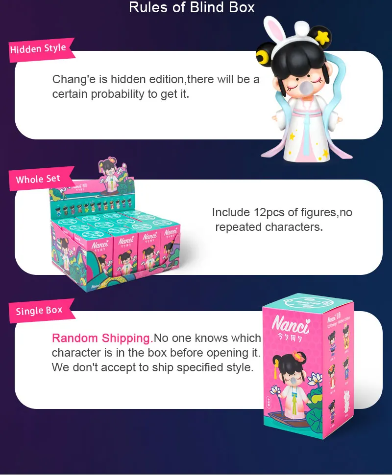 1. Один: включает одну модель, случайную доставку, никто не знает, какой символ находится в упаковке перед открытием. 2. Весь комплект: Включает 12 моделей и символов не повторяются. Если вы хотите 12 различных символов, пожалуйста, закажите весь набор .. 3. Скрытые модели: Chang E-это скрытый стиль, будет определенная вероятность получить его. 4. Выбор товара случайный, и товар находится в слепой упаковке, поэтому мы не можем принять запросы на конкретные товары.
